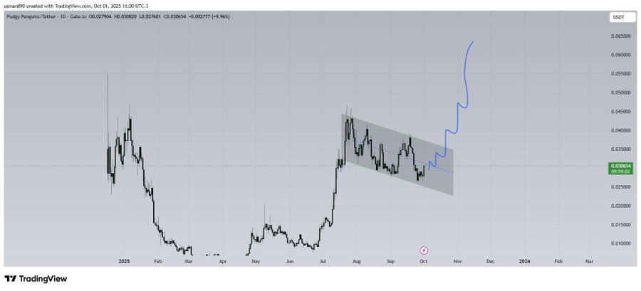 Traders are increasingly pointing to bullish structures on both the short and long timeframes, strengthening the case for continued upside in Pudgy Penguins’ token.
