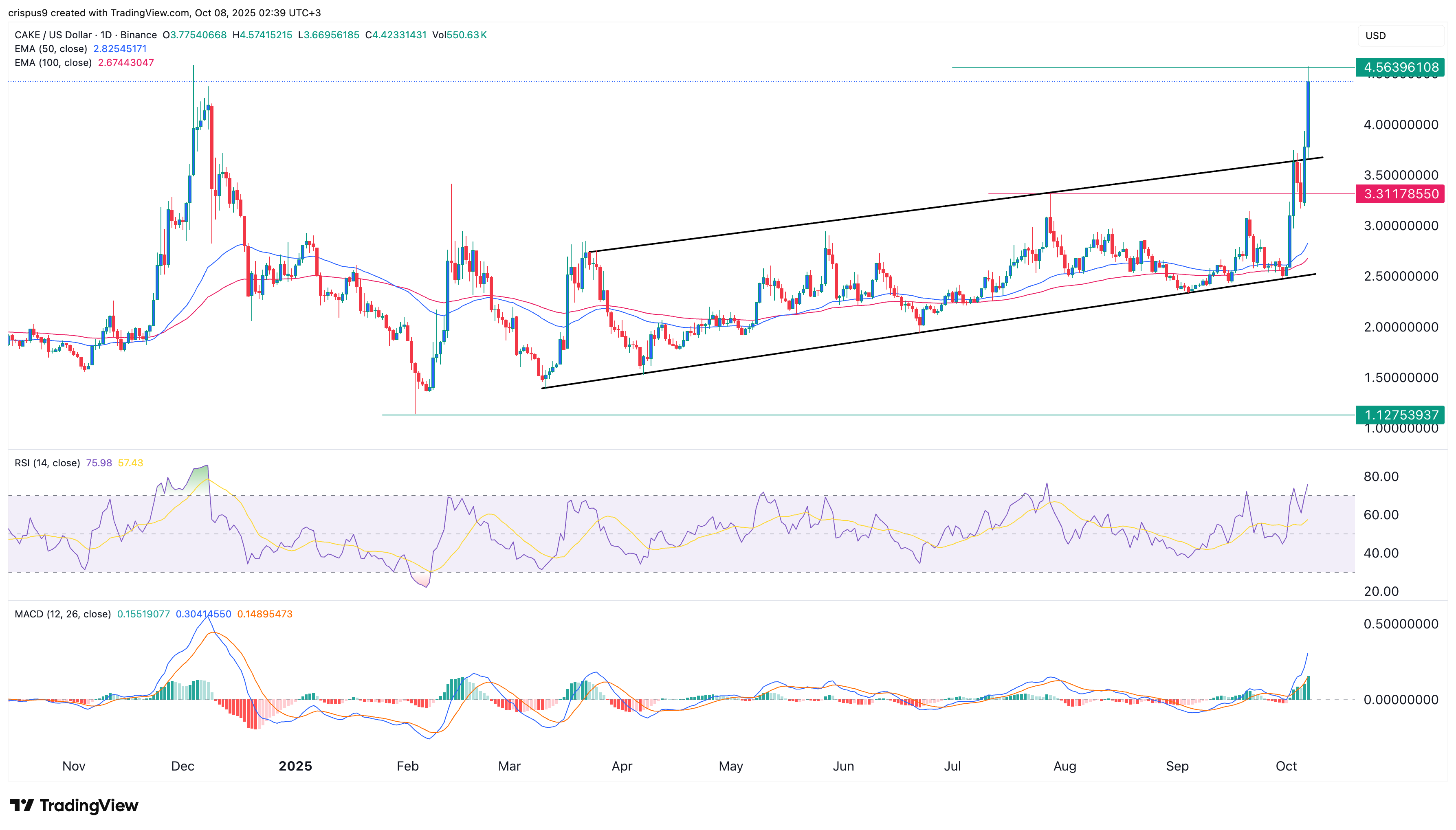 The daily timeframe chart shows that the CAKE price has done well in the past few months. It has jumped from the year-to-date low of $1.1275 to $4.56 as whale accumulation continued.