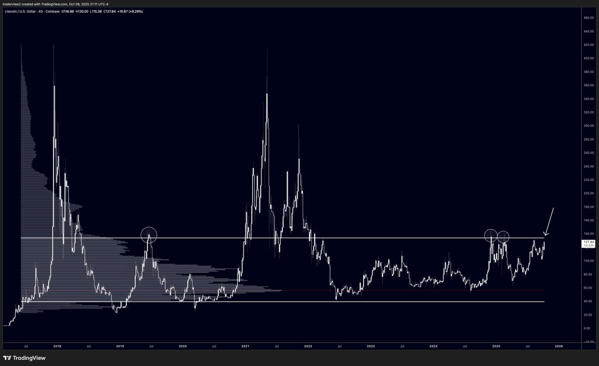 Trader sentiment on X remains cautiously optimistic. Market analyst Dom highlighted that Litecoin is “testing the value area high (VAH) of its eight-year volume profile,” with the $125 zone now acting as major support. Holding this level, he noted, “is the key for a sustained breakout of this multi-year range.”