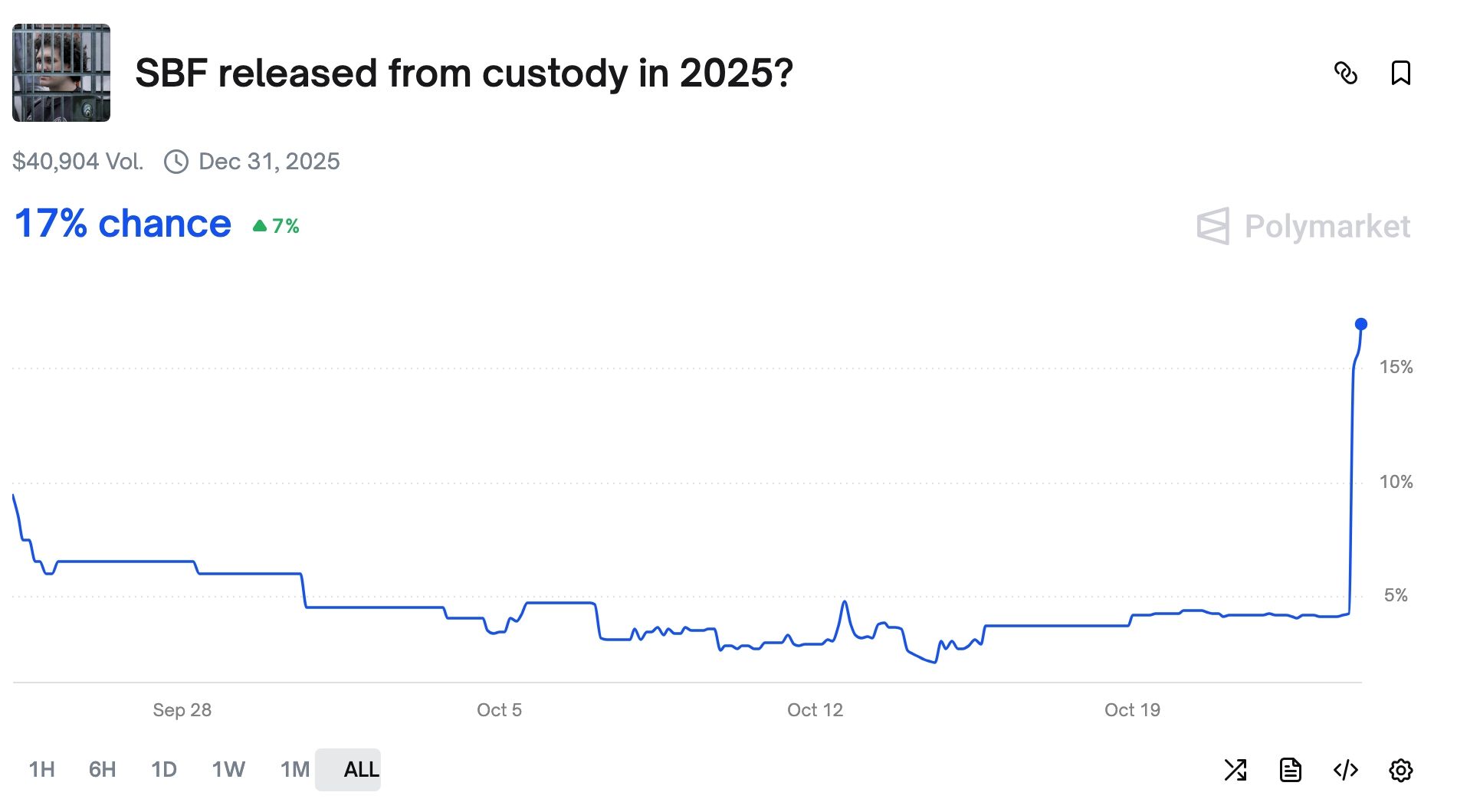 A Polymarket poll with $40,904 in assets has the odds that Trump will pardon Sam Bankman-Fried (SBF) at 16%. While this is a low possibility, it is much higher than the intraday low of 4.2%.