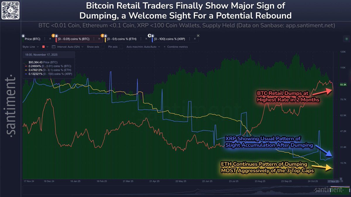 Santiment’s latest on-chain data suggests that heavier retail selling makes the setup look stronger for a rebound in Bitcoin, Ethereum, and XRP. The platform tracks small “shrimp-tier’’ wallets, the group most prone to panic, and they’ve been unloading aggressively across all three assets.