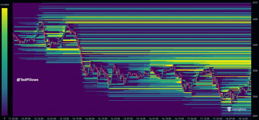 Liquidity maps from Ted Pillows show thick upside bands clustered above spot, especially near $88,000–$90,000, suggesting short-term “max pain” is now to the upside.