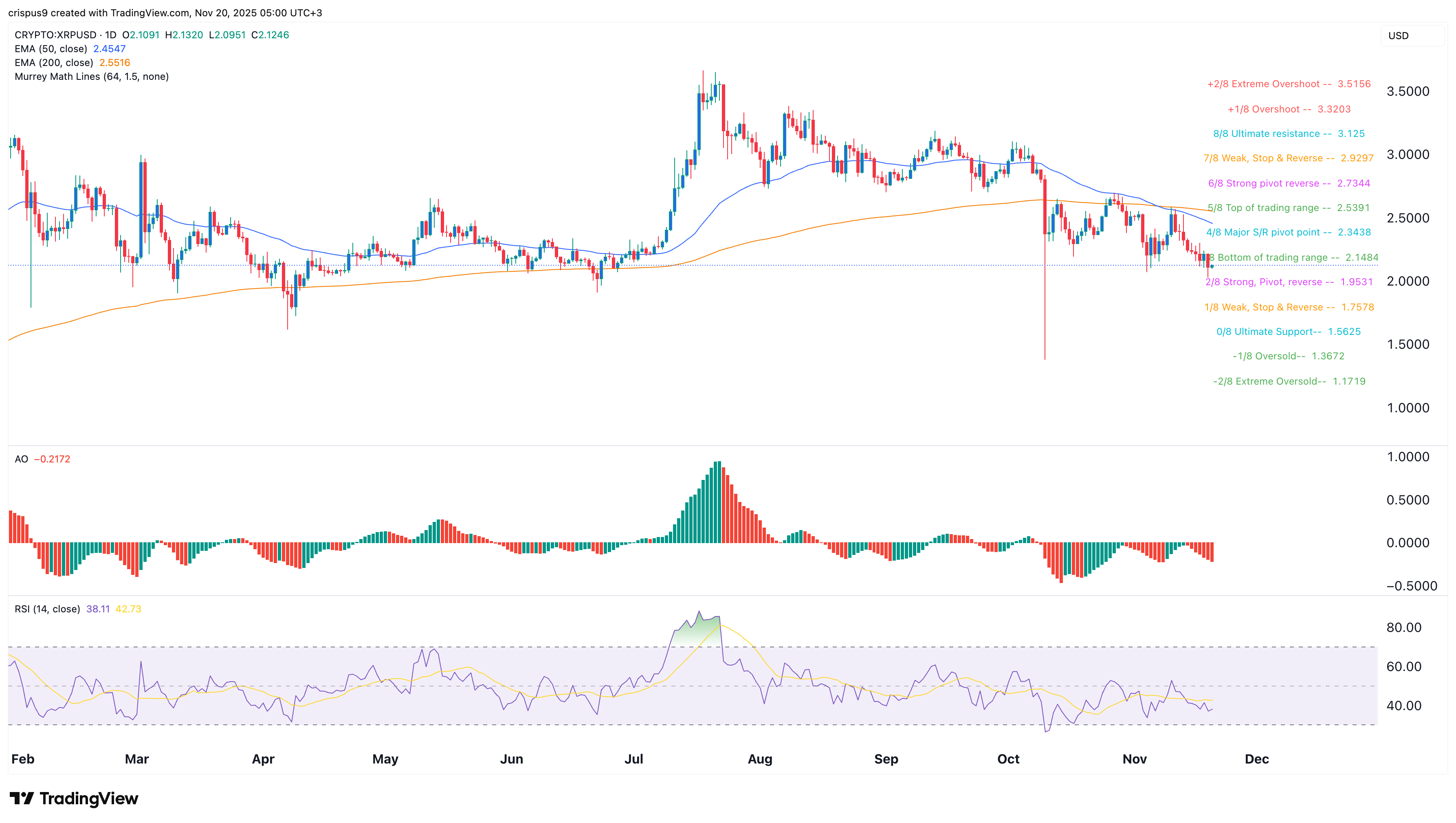 The daily timeframe chart shows that the XRP price has remained under pressure in the past few months as it continued to make a series of lower lows and lower highs.