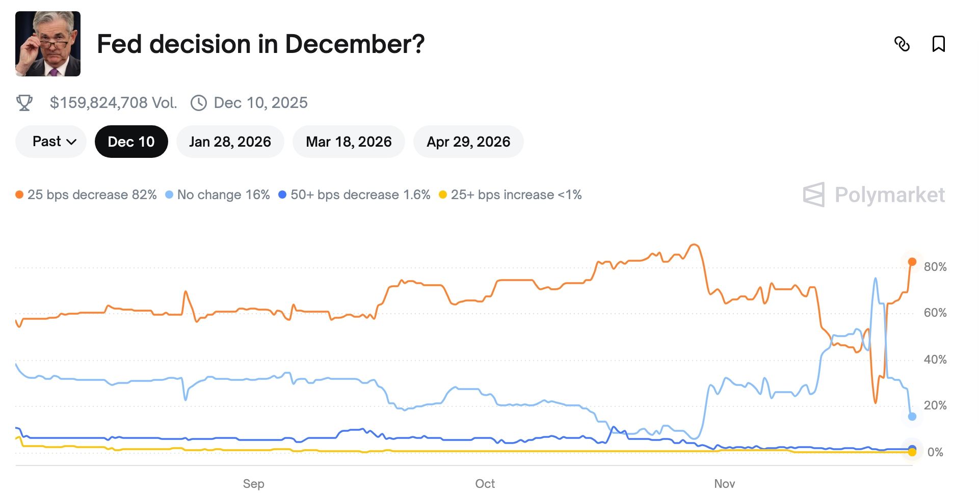 The crypto market rally is happening as odds that the Federal Reserve will cut interest rates in December rose. A Polymarket poll with over $160 million in assets boosted the odds of a cut rose to 83%. Another poll brought the odds of three cuts this year to 83%.