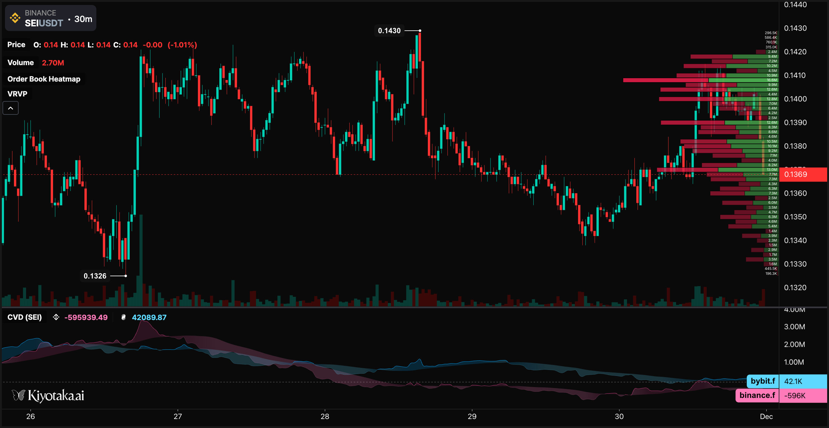 At the same time, November brought one of the strongest fundamental months in SEI’s history, including the Canary Staked SEI ETF (SEIZ) listed on DTCC, Binance joined as a validator, SEI listed on Robinhood, Binance US, OKX, and more, and daily DEX volume climbed 52.6% QoQ.