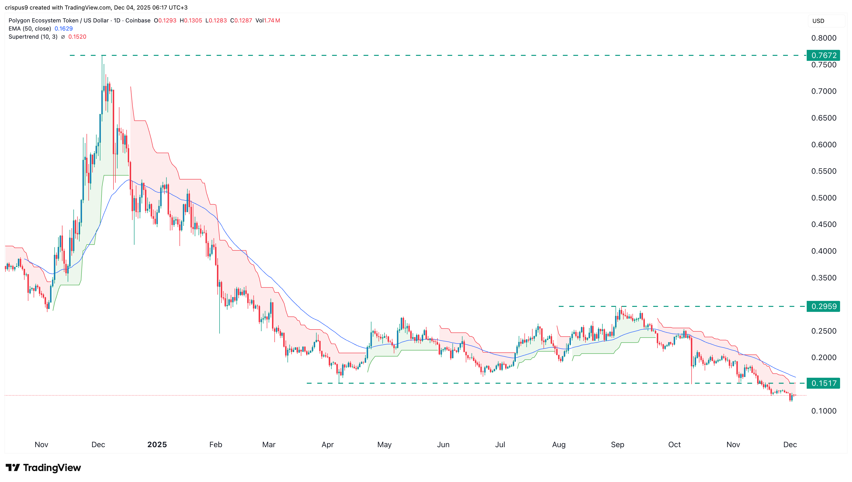 The daily chart shows that the POL price has crashed despite its encouraging metrics. It has plunged from a high of $0.7672 in December last year to $0.1292 today.