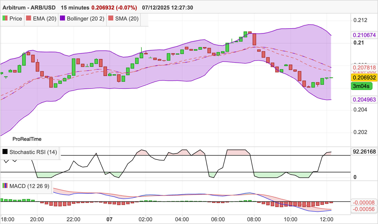 Short-term price action shows compression between $0.2019 and $0.2111. The arbitrum price sits near the overlapping short-term moving averages at $0.207–$0.208, while Bollinger Bands have tightened on the daily charts, as shown below.