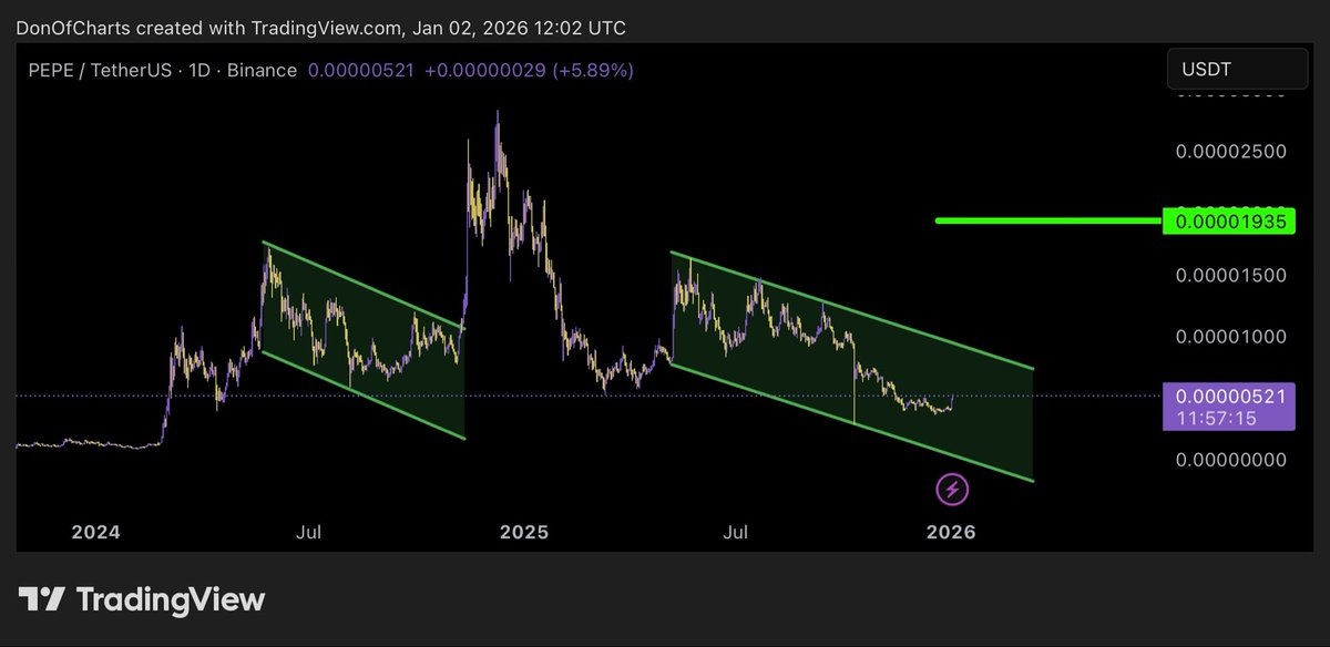 Meanwhile, analyst DonWedge shared a chart titled “$PEPE,” showing price movements inside descending channels from past cycles. The chart points out a repeating channel pattern that was followed by sharp upward moves and highlights a possible upside level near 0.00001935.