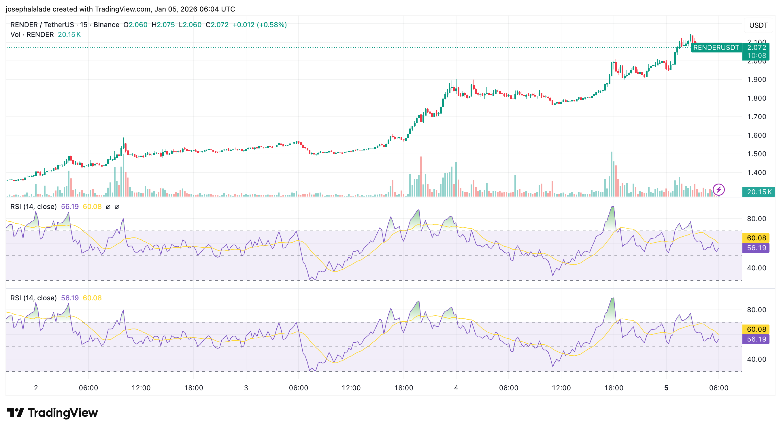 On the 15-minute chart above, the RENDER price shows a series of higher highs and higher lows into the current session. RSI prints around 60, signaling neutral-to-bullish momentum without reaching overbought conditions. This supports the analyst’s comment that price can “continue higher” if support holds, because momentum has cooled without breaking trend structure.