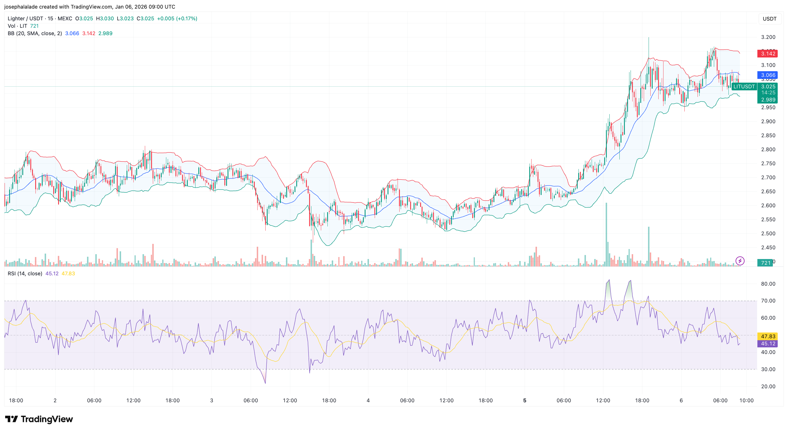 The 9-period SMA near $3.05 is acting as support on dips, while the upper band near $3.15 stopped the latest push higher. The last notable intraday low is around $2.64, which stands out as near-term support.