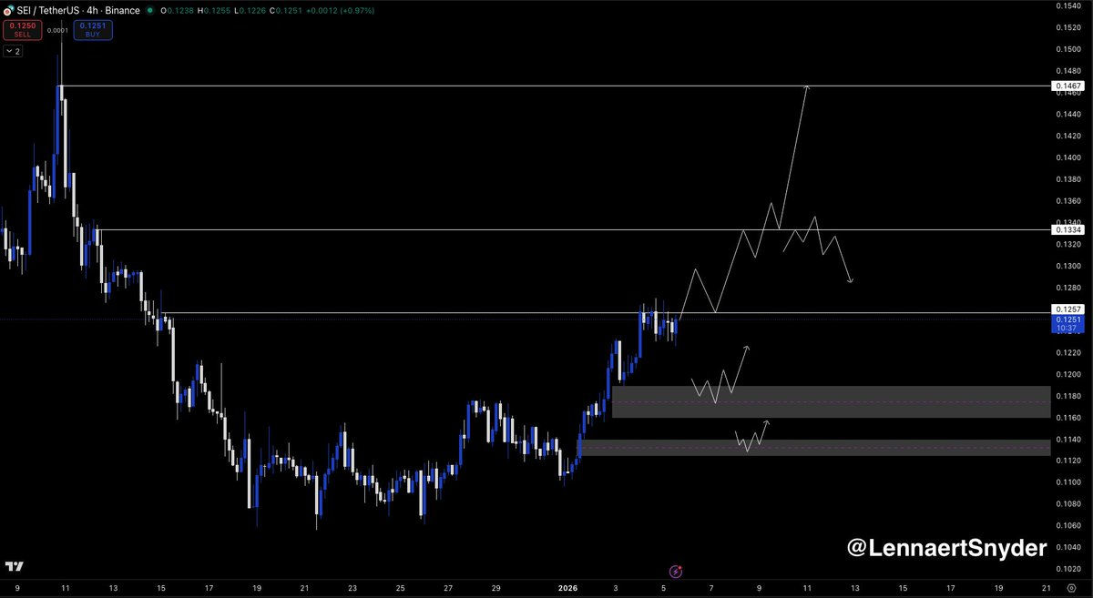 The key market reference is analyst Lennaert Snyder, whose chart maps the active technical structure. SEI price had been trading beneath the $0.1257 resistance level and is now pressing and reclaiming around that zone.