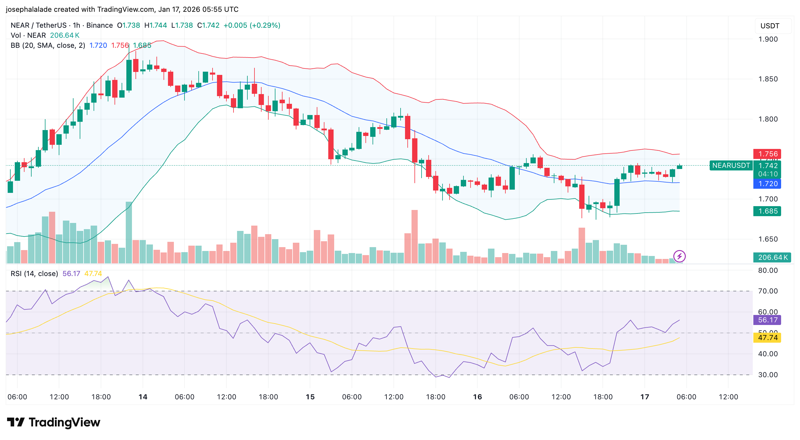 Near Protocol price is trading flat at $1.73, marking a modest 24-hour gain of 0.89% as the asset enters a consolidation phase. While 24-hour trading volume has softened by 10.66% to $154.7 million, the token has maintained its position within a tight intraday range following several days of upward drift. The move comes as traders balance strong ecosystem growth tied to NEAR Intents against a chart structure that remains technically heavy.
