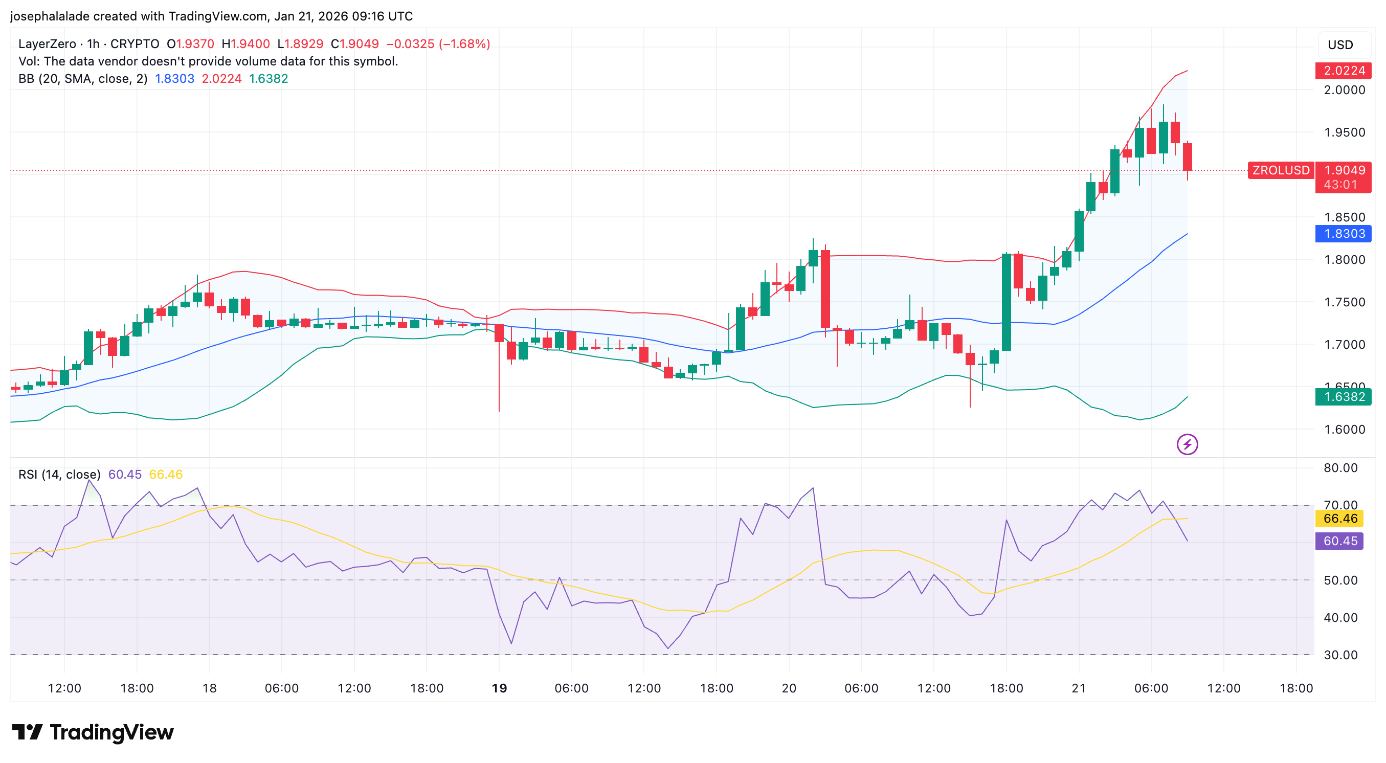 LayerZero price has pressed toward the top of its recent structure. On shorter timeframes, price is trading near the upper Bollinger Band at $2.00, with the lower band at $1.63 framing the recent expansion. RSI has climbed toward the high-60s, showing strong momentum but little room for error if buying cools.