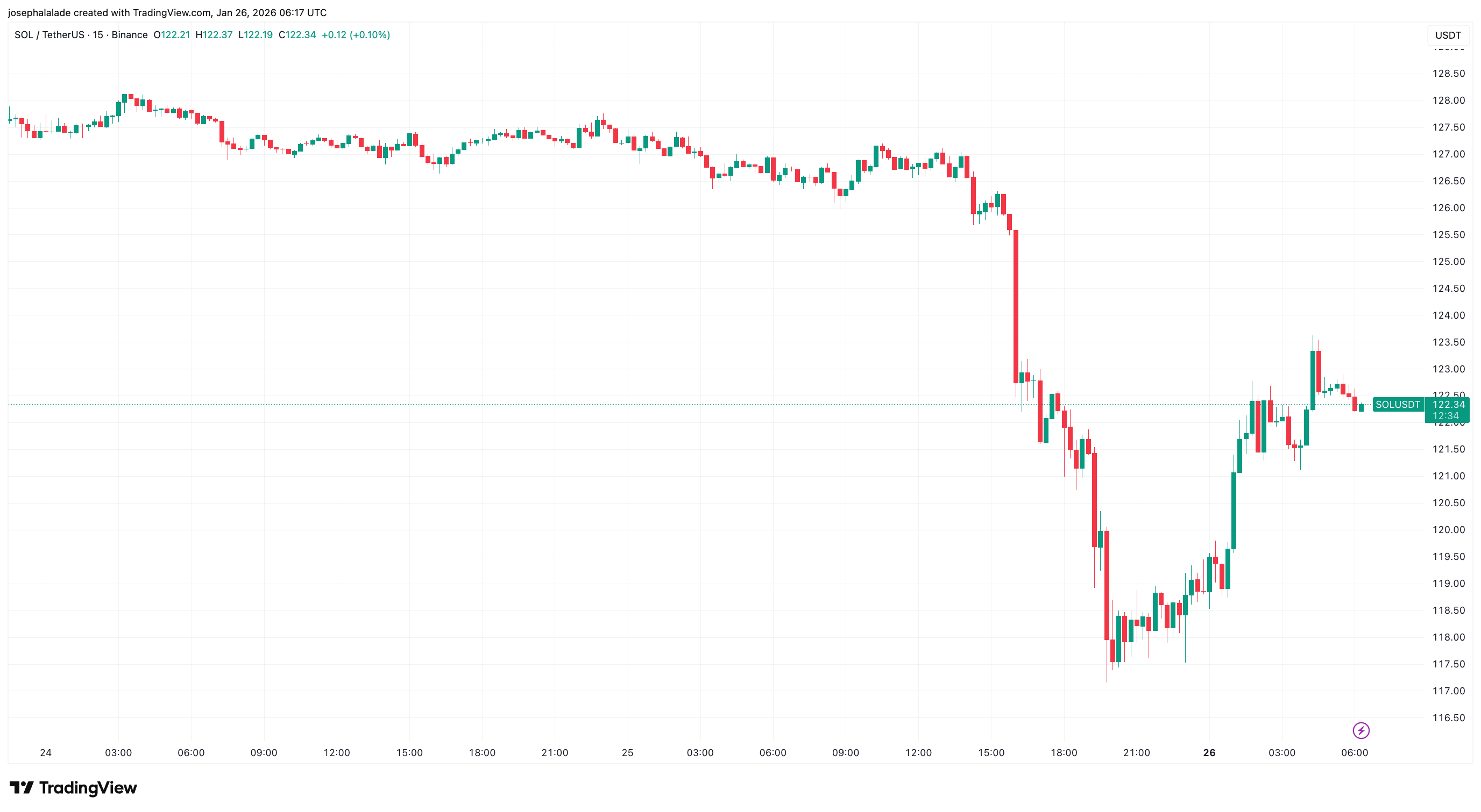 Solana price is hovering around $122.6, down roughly 3.2% on the day. Turnover jumped hard, rising 267.6% to about $5.99 billion over the last 24 hours, while market cap eased to $69.37 billion. Price is sitting back inside a support area that has been tested multiple times since 2024, at a moment when risk appetite across crypto continues to thin out.