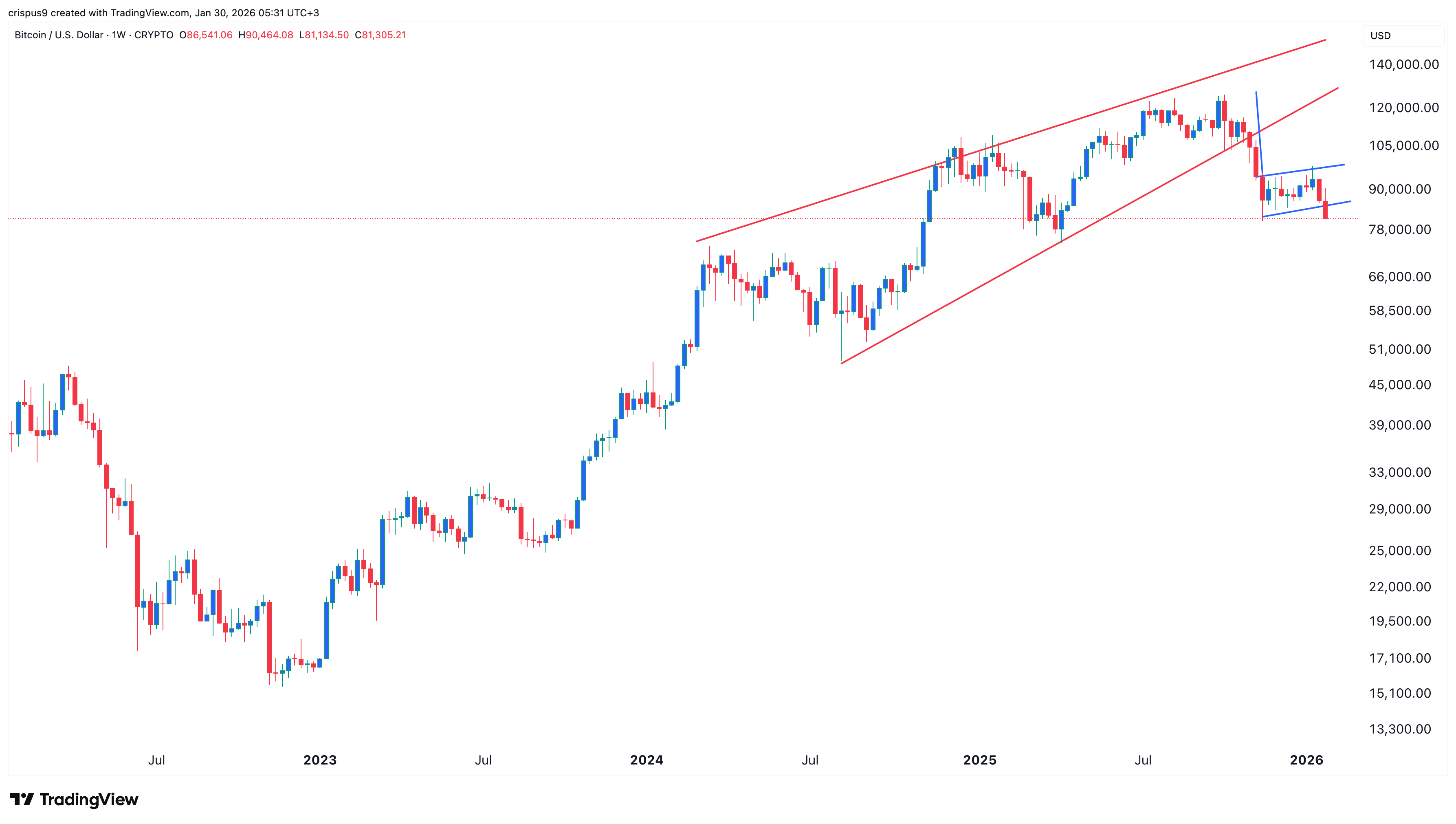 Bitcoin price continued its strong bearish trend on Friday morning as risks in the crypto market rose. BTC tumbled to $81,000, making it the worst-performing major asset. This article explores why the coin may continue falling as it has formed major bearish patterns on the weekly chart.