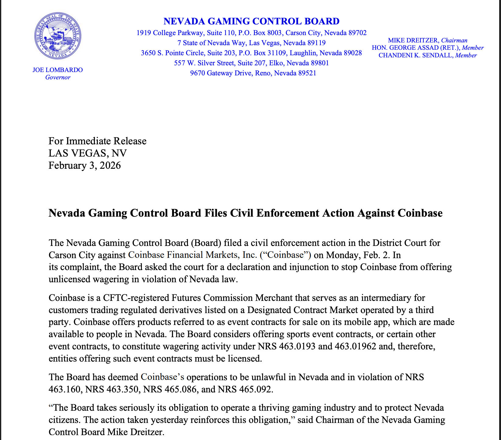 Nevada’s top gaming regulator has filed a civil enforcement lawsuit accusing Coinbase of running unlicensed wagering in the state. The Nevada Gaming Control Board (NGCB) says Coinbase offered sports event contracts that count as betting under state law.