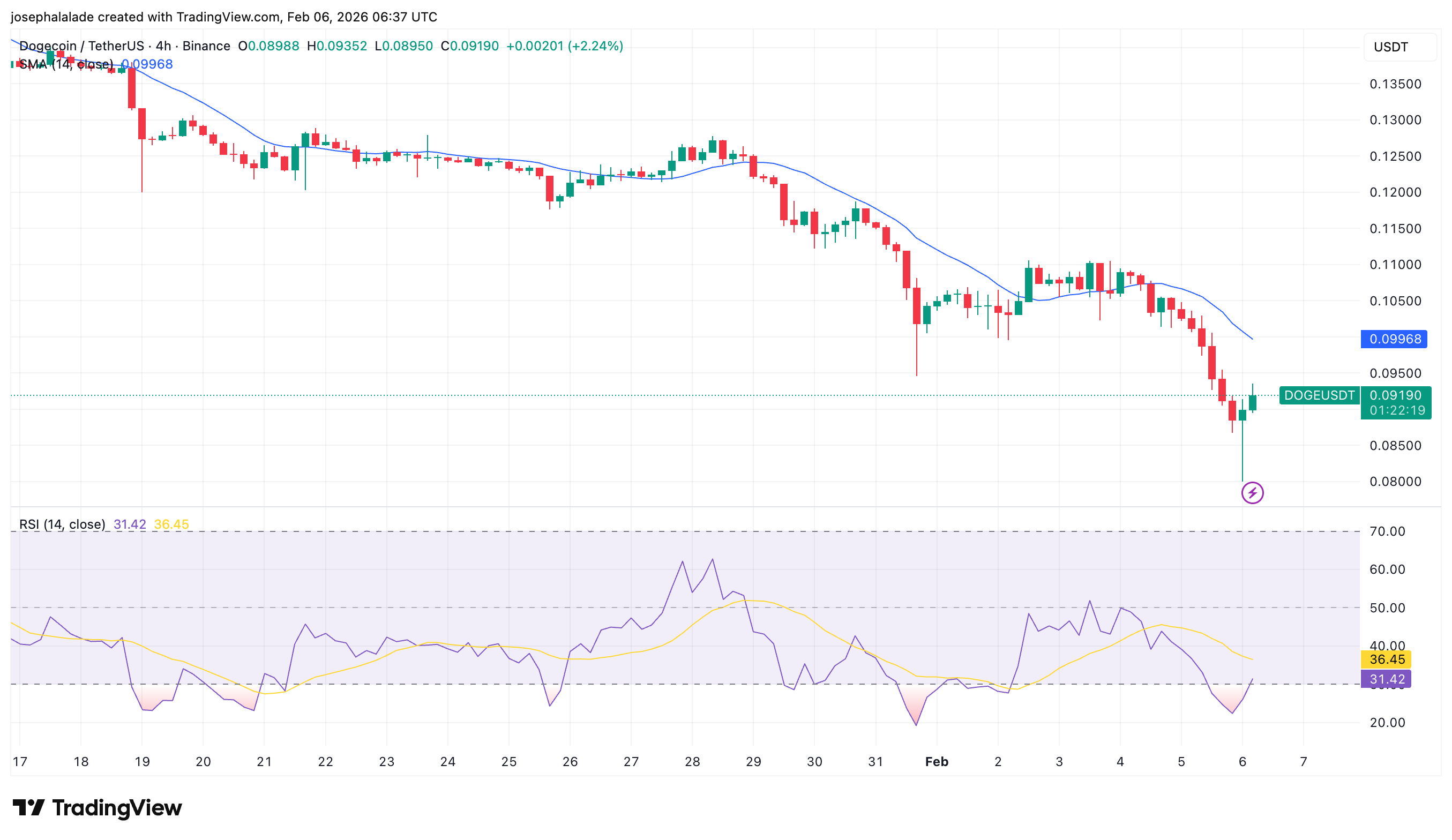 Dogecoin is down by 8.39% over the last 24 hours as its price fell below the $0.10 level due to risk-off sentiments. Currently trading at $0.091, the meme coin has traded between $0.08157 and $0.1026 over the last day, with intraday volatility primarily driven by forced selling.