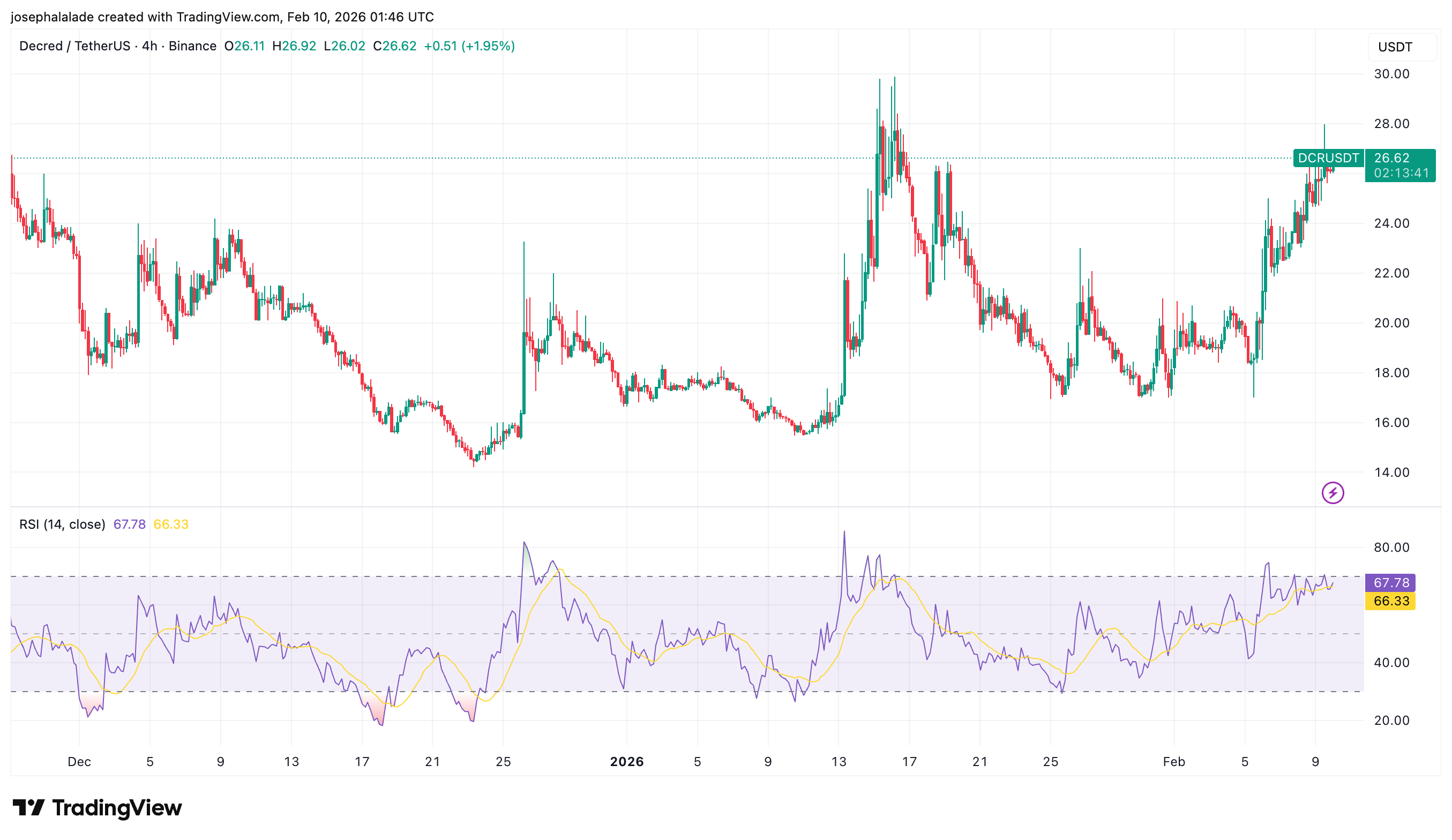 Technical indicators suggest Decred’s price is no longer trading within a defined range. The inverse head-and-shoulders pattern that developed from December into January has already broken higher, with the $22.5–$23.0 neckline broken and confirmed on multiple 4-hour closes. Decred price is trading around $26.6, roughly 15% above the breakout level, with no immediate rejection.