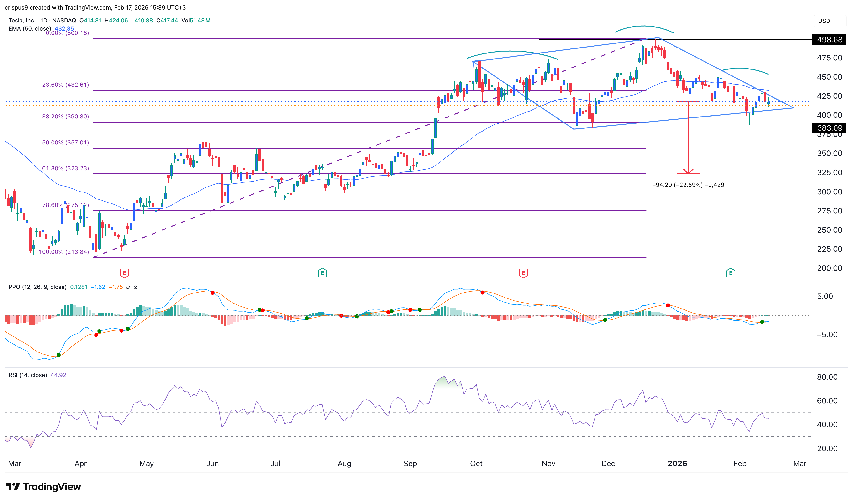 Tesla stock price has remained under pressure this year, moving from a high of $500 in December last year to the current $417. Its market capitalization declined from a record high of $1.69 trillion to $1.57 trillion. This article explores why the stock may have a strong bearish breakdown after forming a risky pattern.