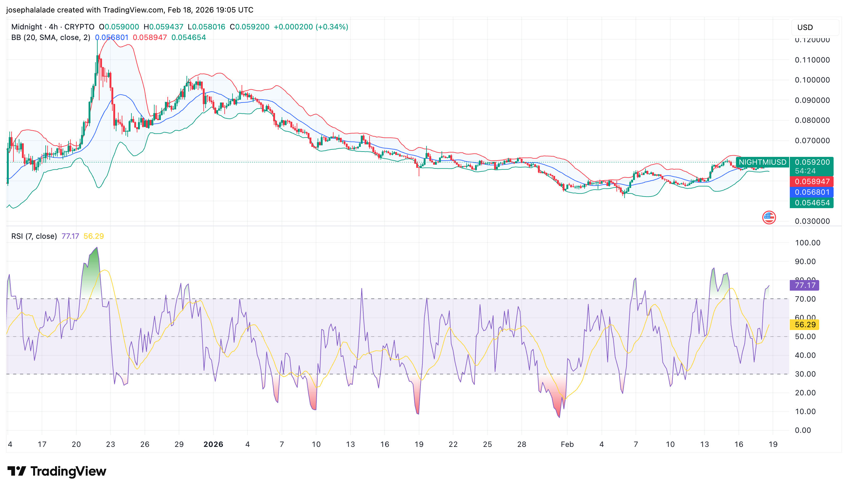 According to TradingView’s four-hour chart, Midnight (NIGHT) is trading near the upper half of its Bollinger Bands, with the mid-band at $0.0568 and the upper band at $0.0589. This placement reflects persistent bid-side interest but also shows that upside has become crowded.