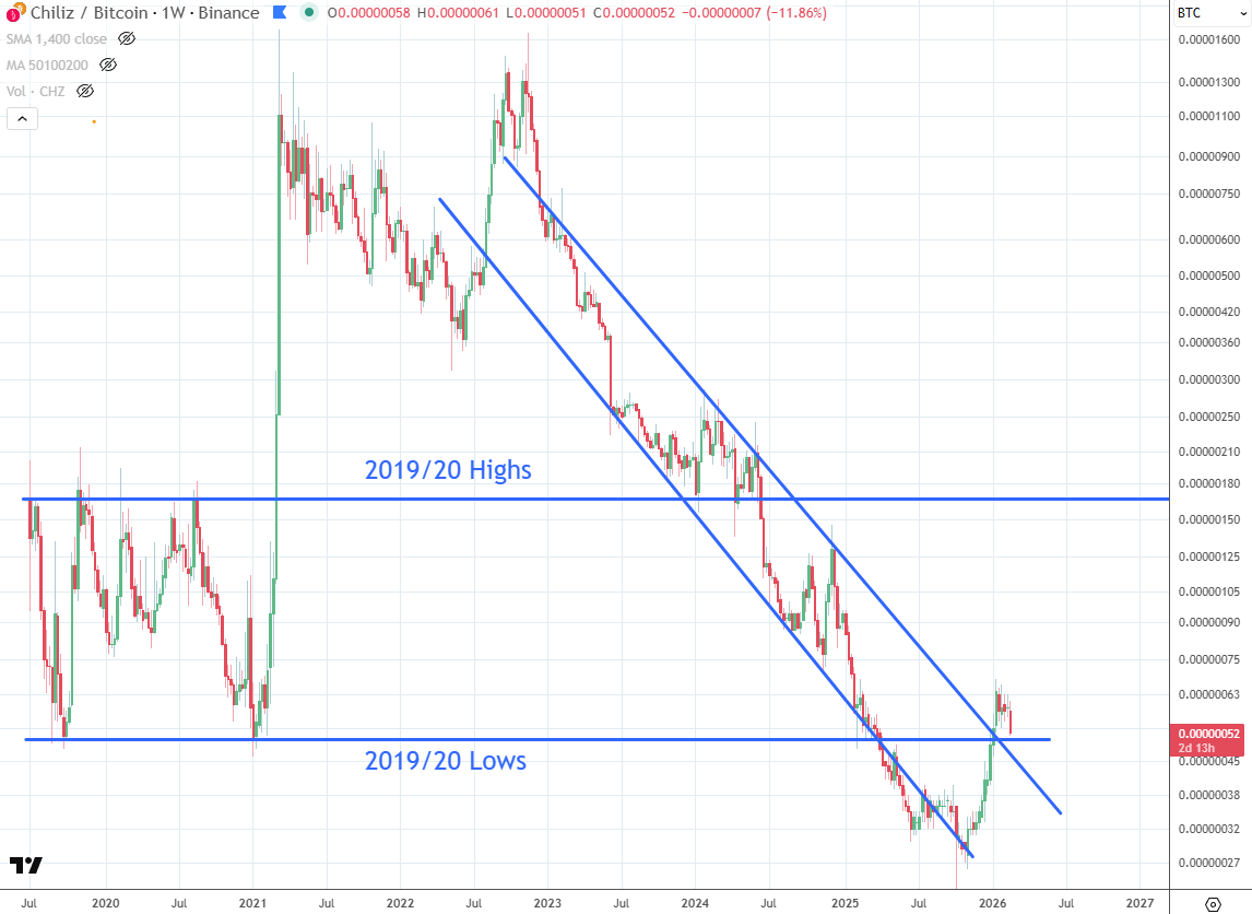 Crypto analyst Christian Ott notes that CHZ is down roughly 10% against Bitcoin this week but argues the structure holds as long as the price stays above 50 sats. He identifies the 2019–2020 lows as a critical support zone and is watching for a retest and potential bounce from that area.