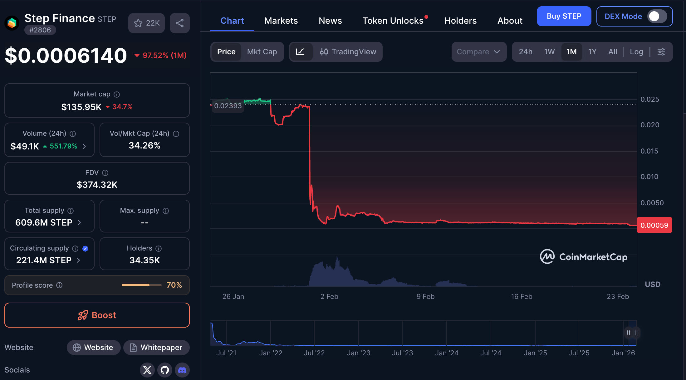 Step Finance, a foundational analytics and portfolio dashboard for the Solana ecosystem, announced this morning that it will immediately shut down due to a treasury breach discovered at the end of January. This has resulted in the theft of multiple millions of SOL, significantly reducing STEP’s price.