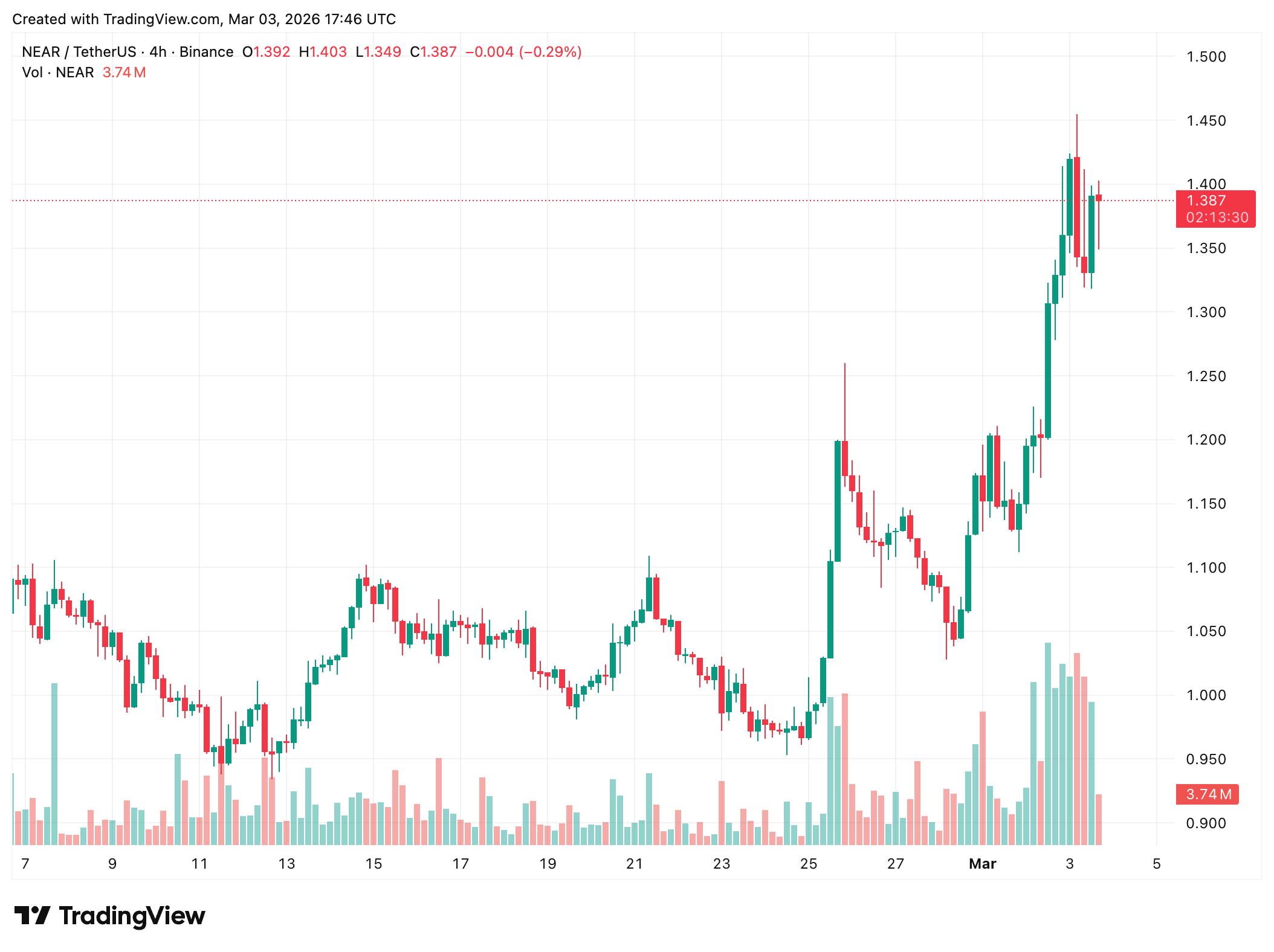 The 4-hour chart shows NEAR coin climbing from sub-$1.00 territory on February 23 to the $1.44 peak in a near-vertical impulse, with buyers consistently absorbing each pullback into the $1.15–$1.20 range before the final leg higher. Price is now consolidating around $1.38, just above the $1.40 level that served as the dotted reference line on the TradingView chart.