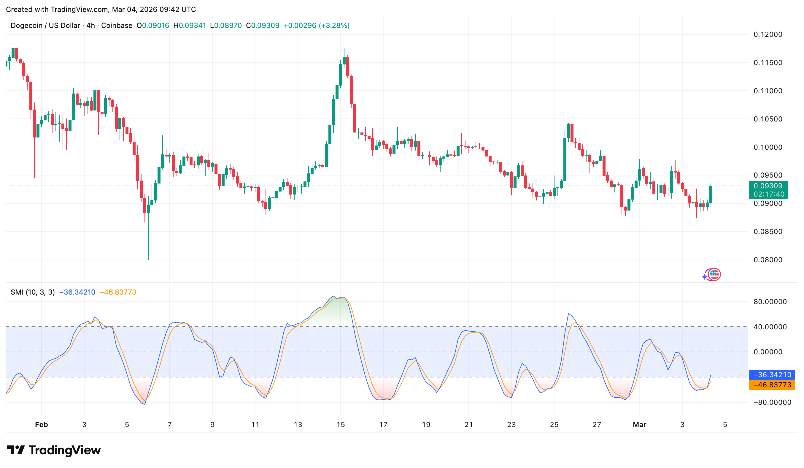 Through February and into March, each SMI trough in this zone has coincided with a short-term bounce, selling faded near $0.088 again, and the pattern is repeating. That alone doesn’t make a trend, but it tells where buyers have consistently stepped in.