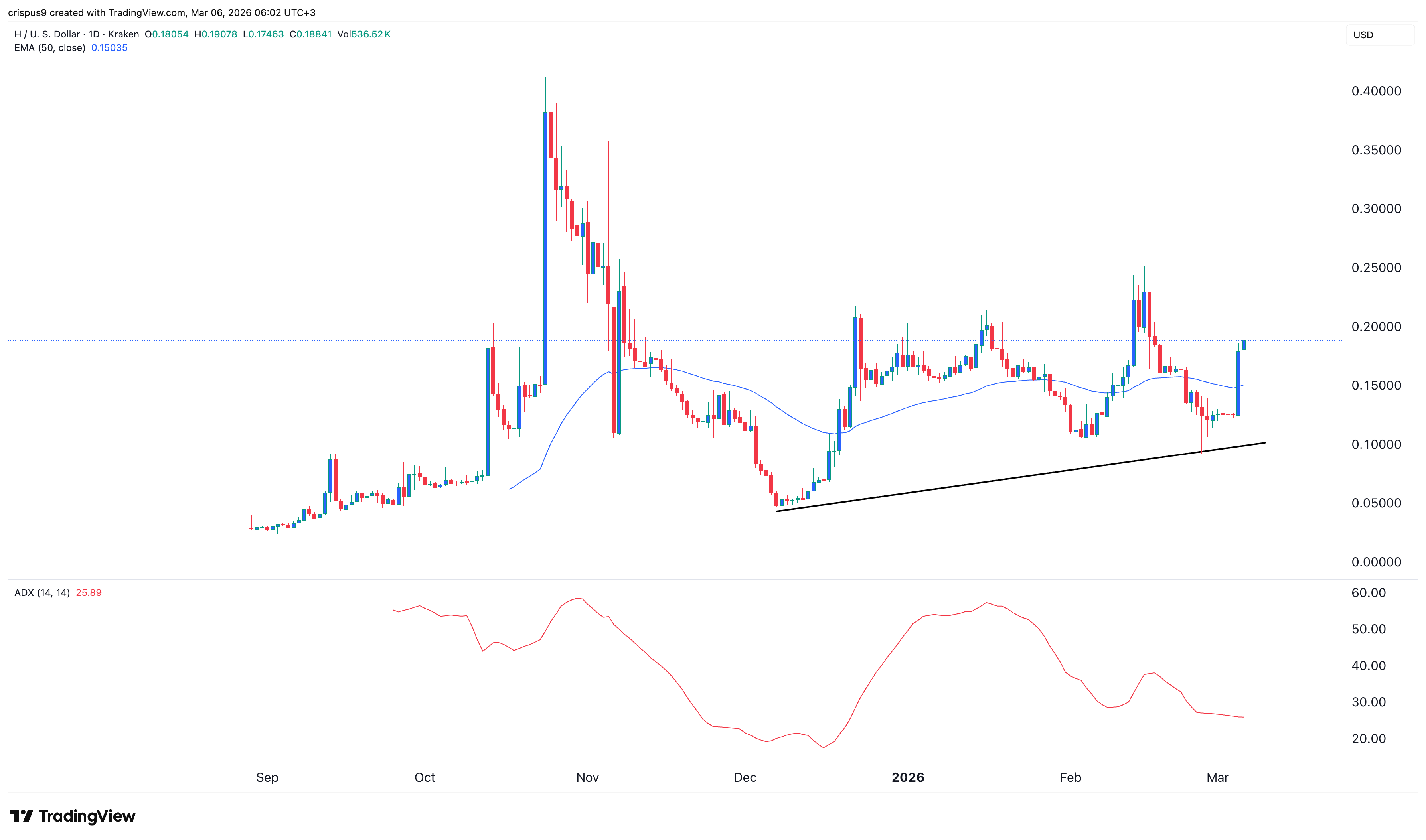 The daily chart shows that the Humanity Protocol token rebounded to $0.1885, its highest level since February 17. It has moved above the 50-day Exponential Moving Average.
