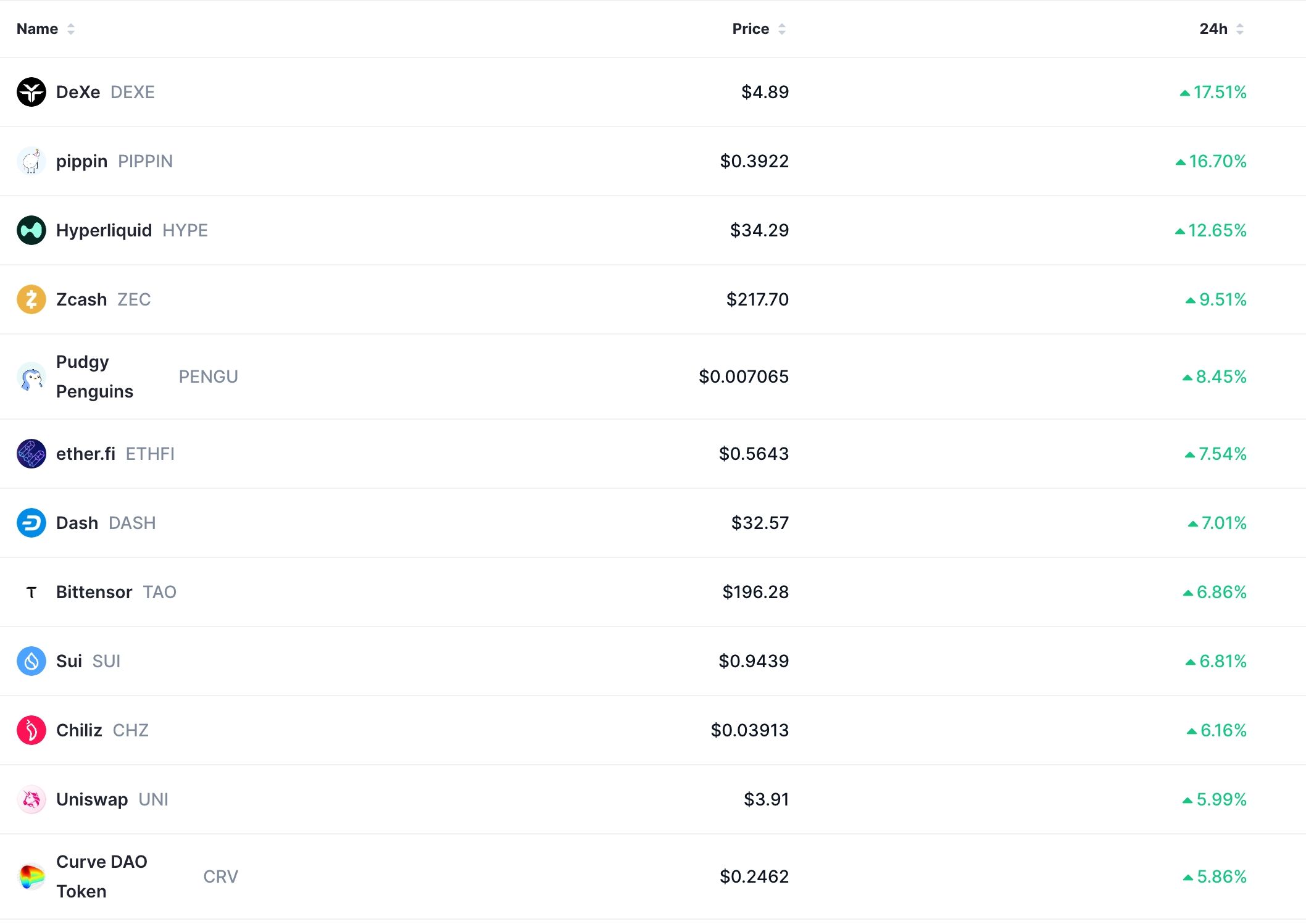 Most altcoins were in the green, with DeXe, Pippin, Hyperliquid, Zcash, and Pudgy Penguins being the top gainers. All these tokens jumped by over 8% each.
