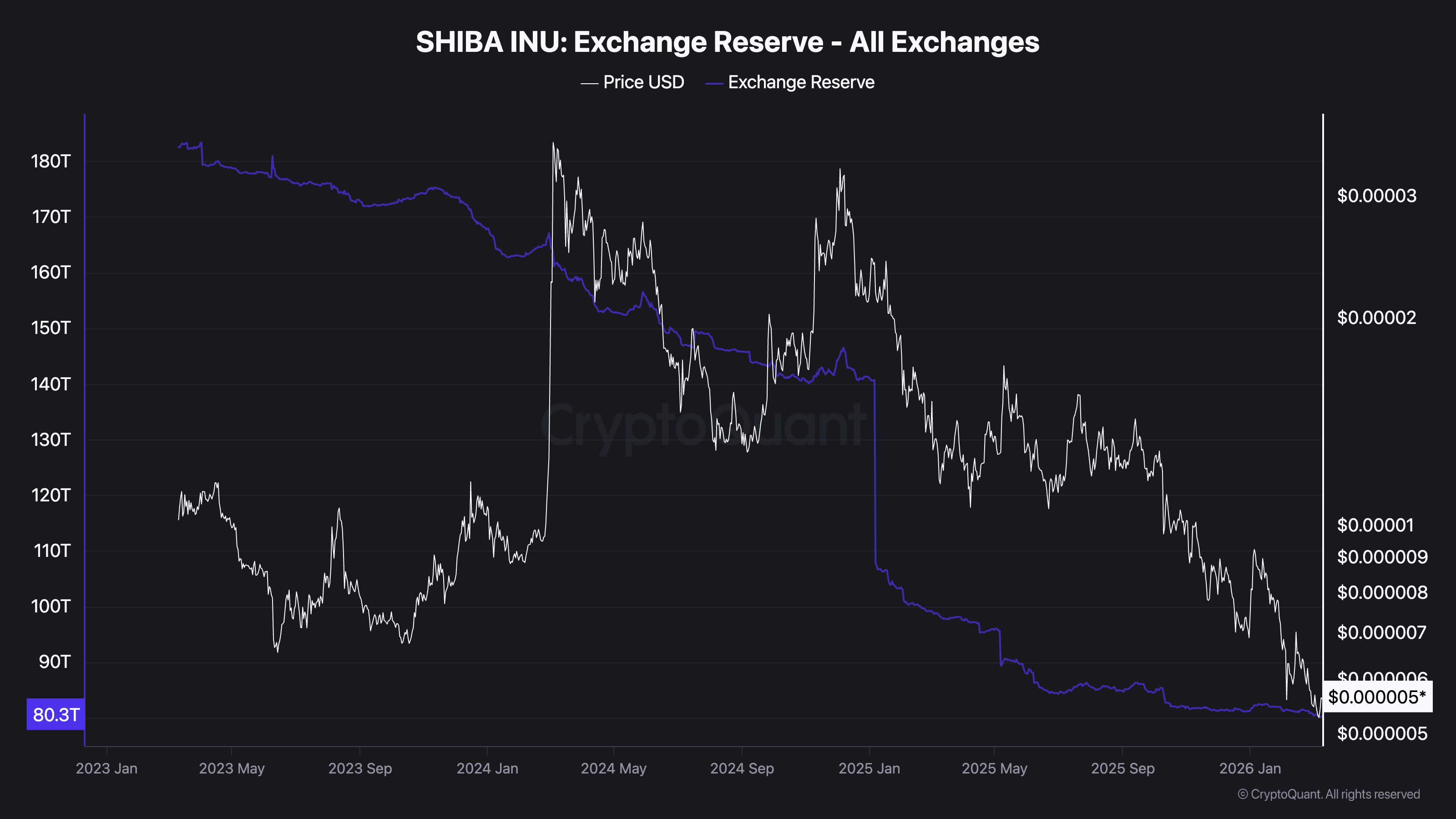 The most structurally significant development for Shiba Inu crypto right now is what’s happening on-chain. Exchange reserves, as tracked by CryptoQuant, have declined to 80.3 trillion SHIB, a level not seen since at least early 2023, when reserves were closer to 180 trillion.