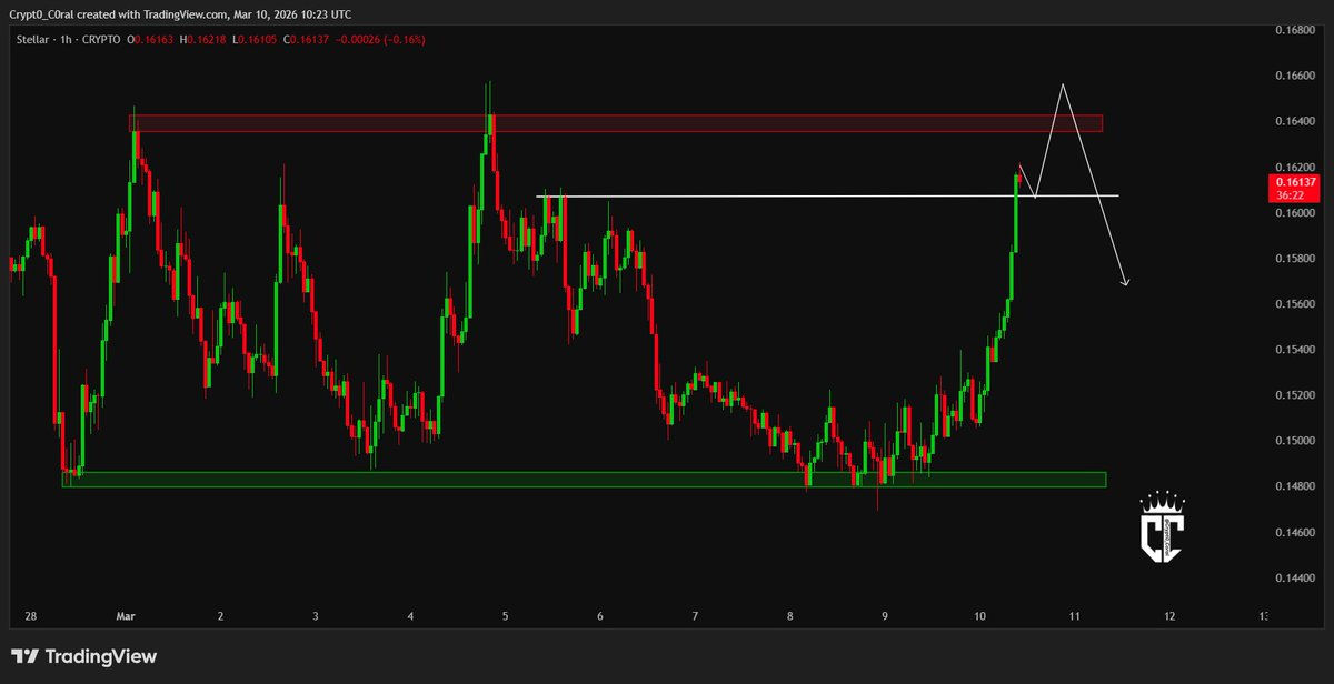 Crypto Coral, posting March 10, sees it differently in the near term. XLM coin is approaching key resistance at around $0.164 on the chart, and Crypto Coral’s read is that rejection here could trigger another pullback. The chart shows price pressing into the resistance zone with no clear momentum confirmation, a pattern consistent with a range high failure rather than a breakout setup.