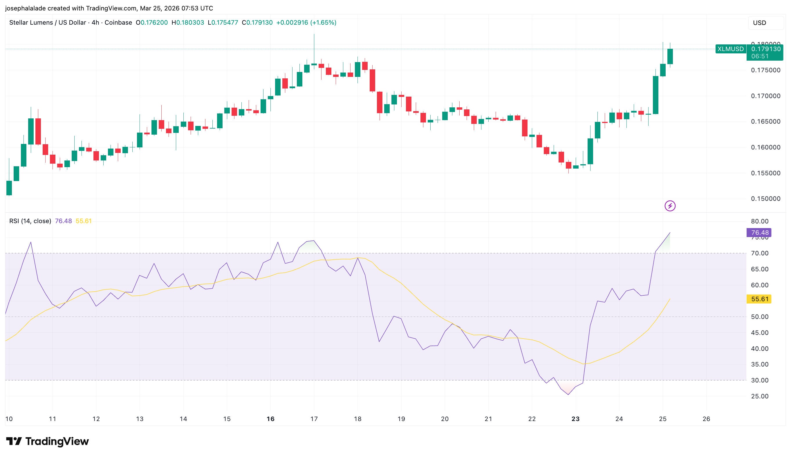 Stellar price is up 8.59% over the past 24 hours, trading at $0.1801 as buyers pushed the coin cleanly above both its short- and medium-term exponential moving averages.