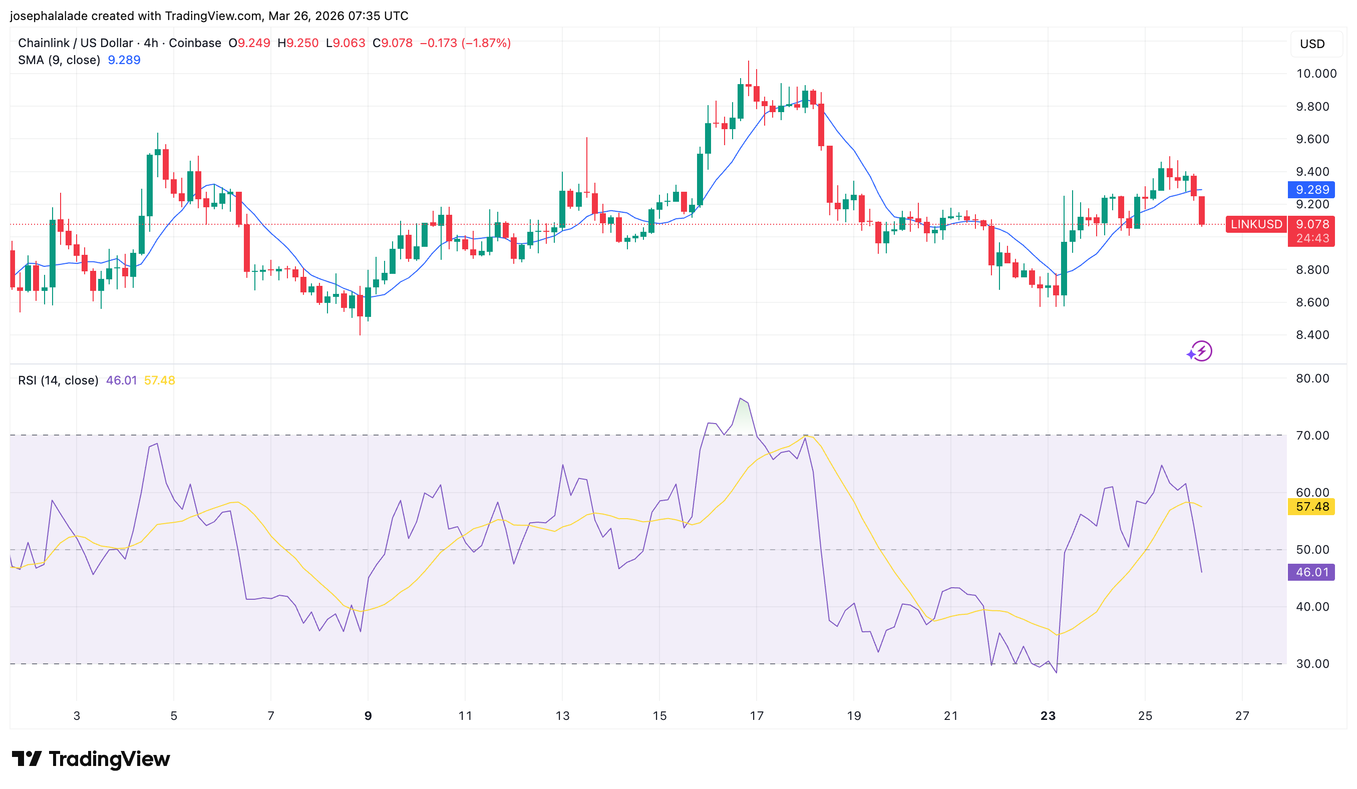 On the 4-hour chart, Chainlink price closed below the SMA(9) at $9.289, and that level immediately flipped to resistance. Price had recovered from the March 21–22 low at $8.60 back toward $9.40, but sellers stepped in before any structure formed.