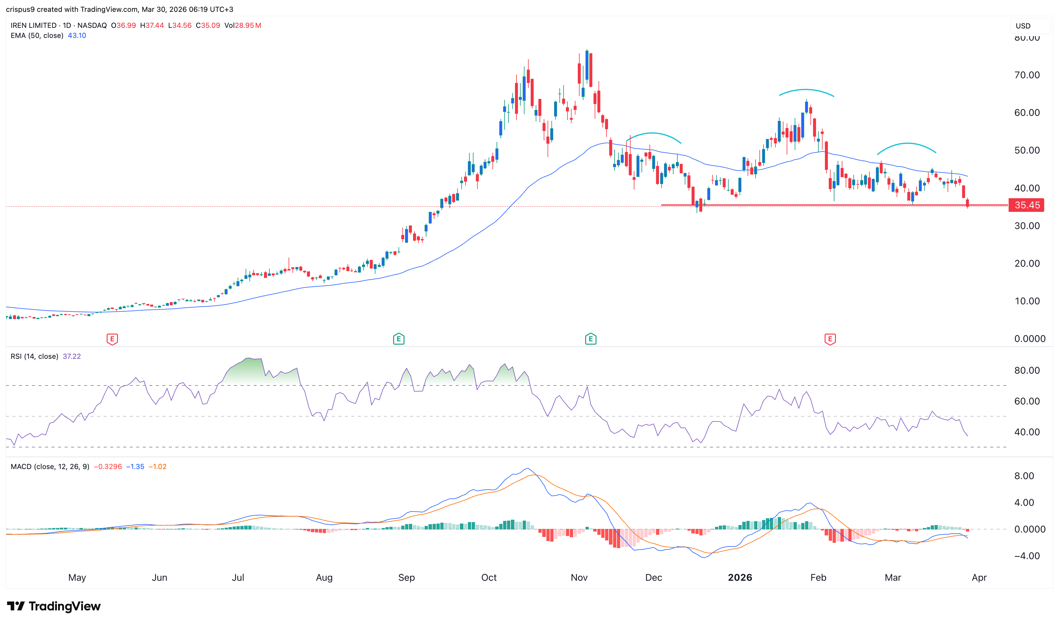 The daily timeframe chart shows that the IREN share has dropped sharply in the past few months, moving from a high of $76 in November last year to the current $35.