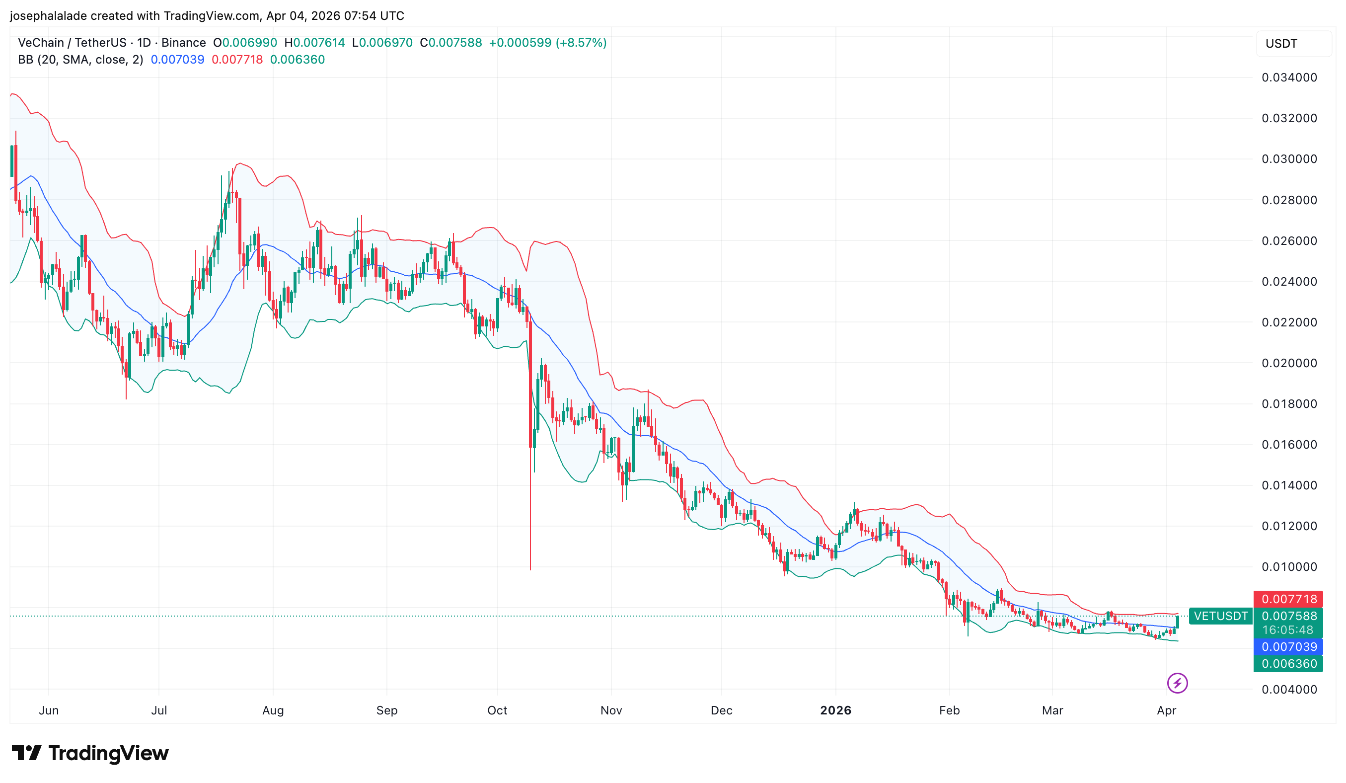 The technical picture is cautious but cleaner than it’s been in months. VeChain price is trading above the 20-period SMA at $0.007039, pressing into the upper Bollinger Band at $0.007718, a level that has repeatedly capped rallies since the October flush. The lower band at $0.006360 has served as structural support throughout Q1. VET coin price is stretched relative to the middle band, which keeps any clean continuation from being a given.