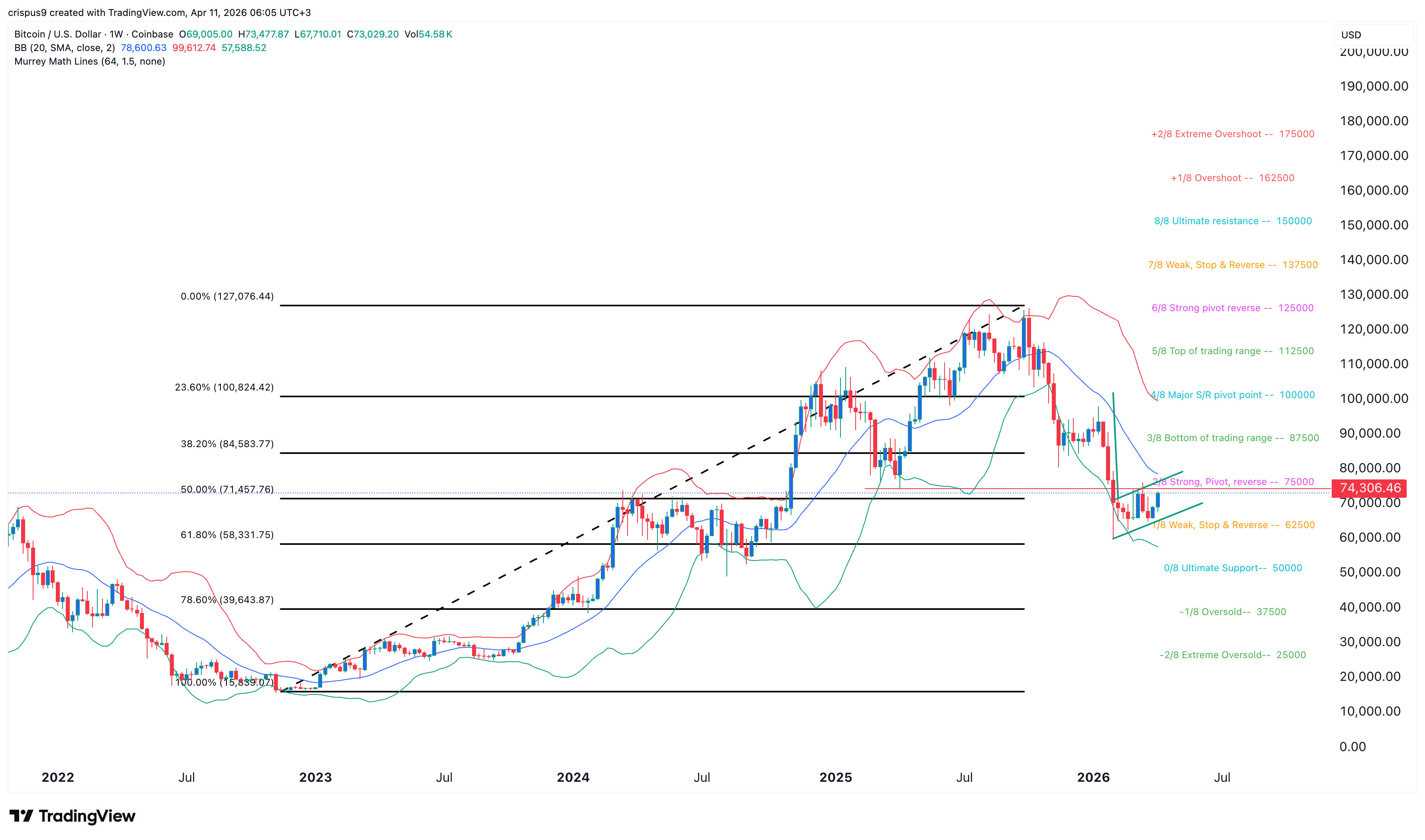 The coin remains below the 50-week Exponential Moving Average (EMA) and the middle line of the Bollinger Bands indicator. Also, it has dropped below the Strong, Pivot and Reverse level of the Murrey Math Lines tool.