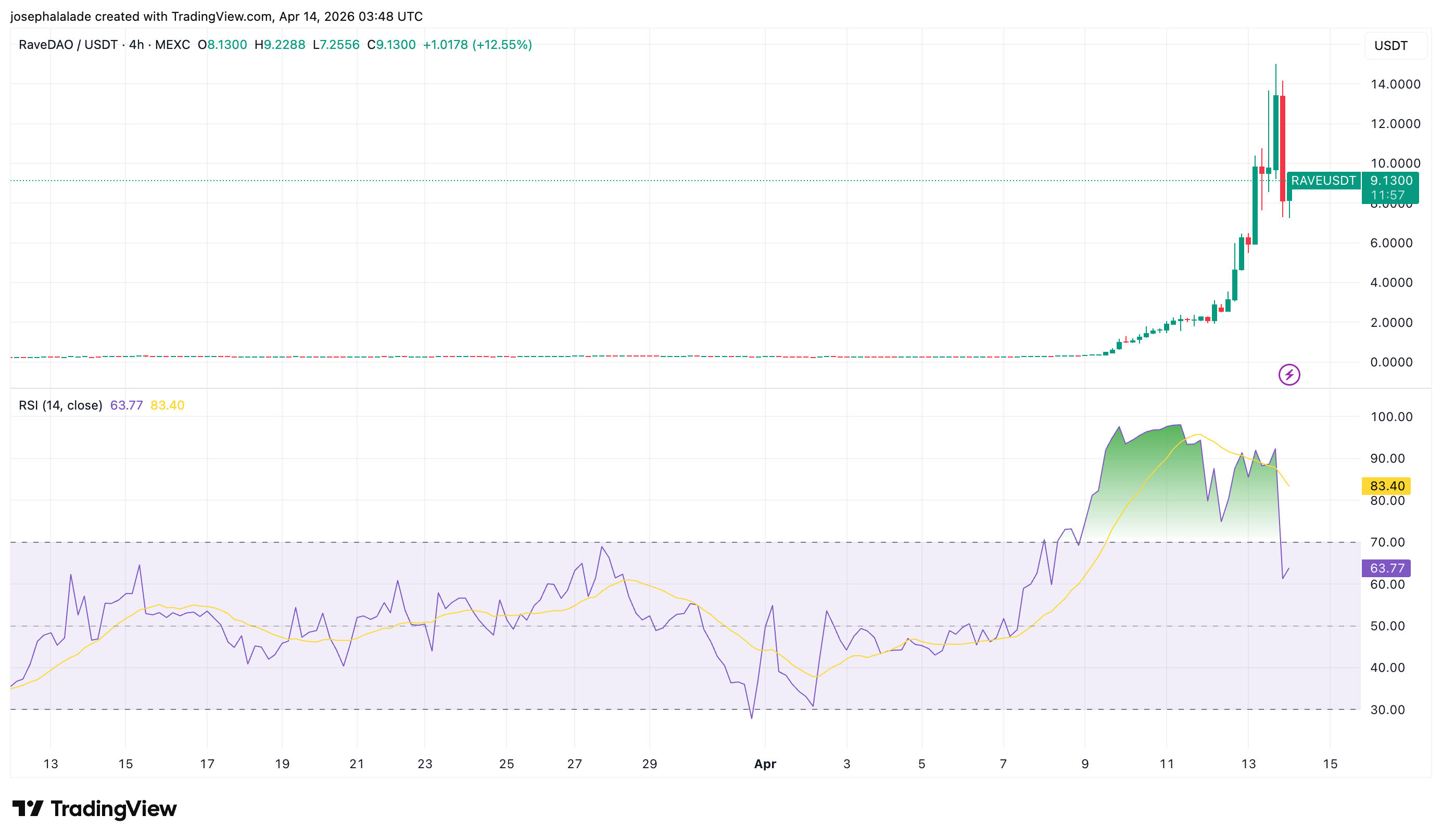 The 4-hour chart provides a cleaner view of where the RaveDAO coin stands technically. RSI ran above 95 at the peak of the squeeze last Saturday, deeply overbought on any timeframe, and has since dropped sharply to 63.77, crossing below its signal line, which remains elevated at 83.40. That crossover is a bearish signal on the 4H, and the gap between the two readings suggests momentum has shifted faster than most continuation setups allow for.