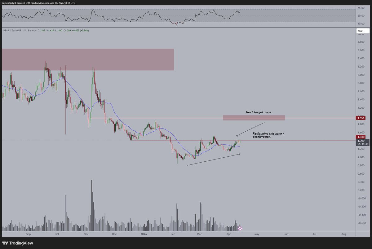 Van de Poppe’s daily chart marks the $1.399–$1.410 band as the level to hold for acceleration to begin. Above it, the next resistance zone he has identified sits at $1.951. His near-term NEAR price prediction runs to $3–4, with the price extending to $4–5 in the months following a confirmed breakout.