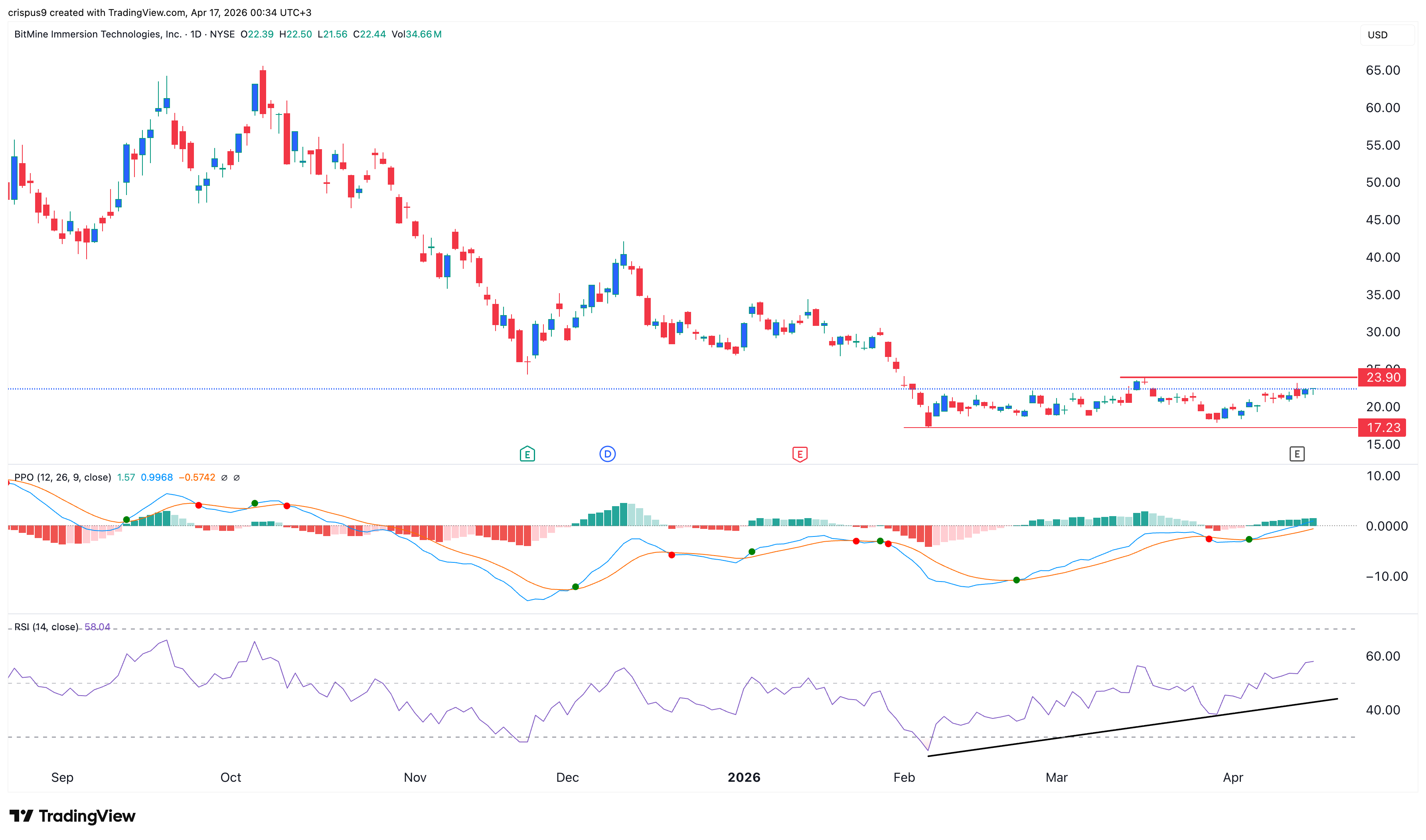 The daily chart shows that the BitMine stock has formed some highly bullish signs. It has formed a double-bottom pattern at $17.25 and a neckline at $23.90, its highest level in March.