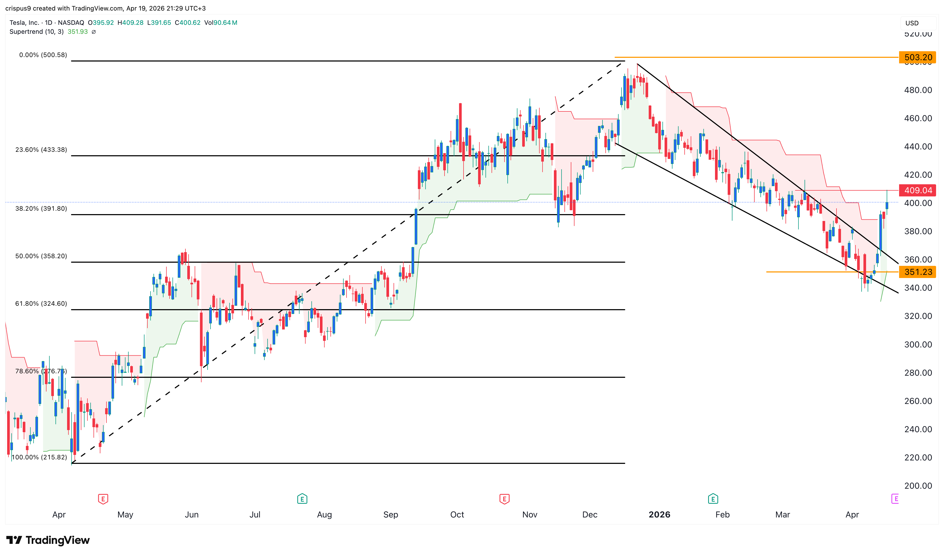 The stock has moved above the 38.2% Fibonacci retracement level at $391. It has jumped above the 50-day and 100-day exponential moving averages (EMAs). Also, the Supertrend indicator has turned green for the first time since December last year.
