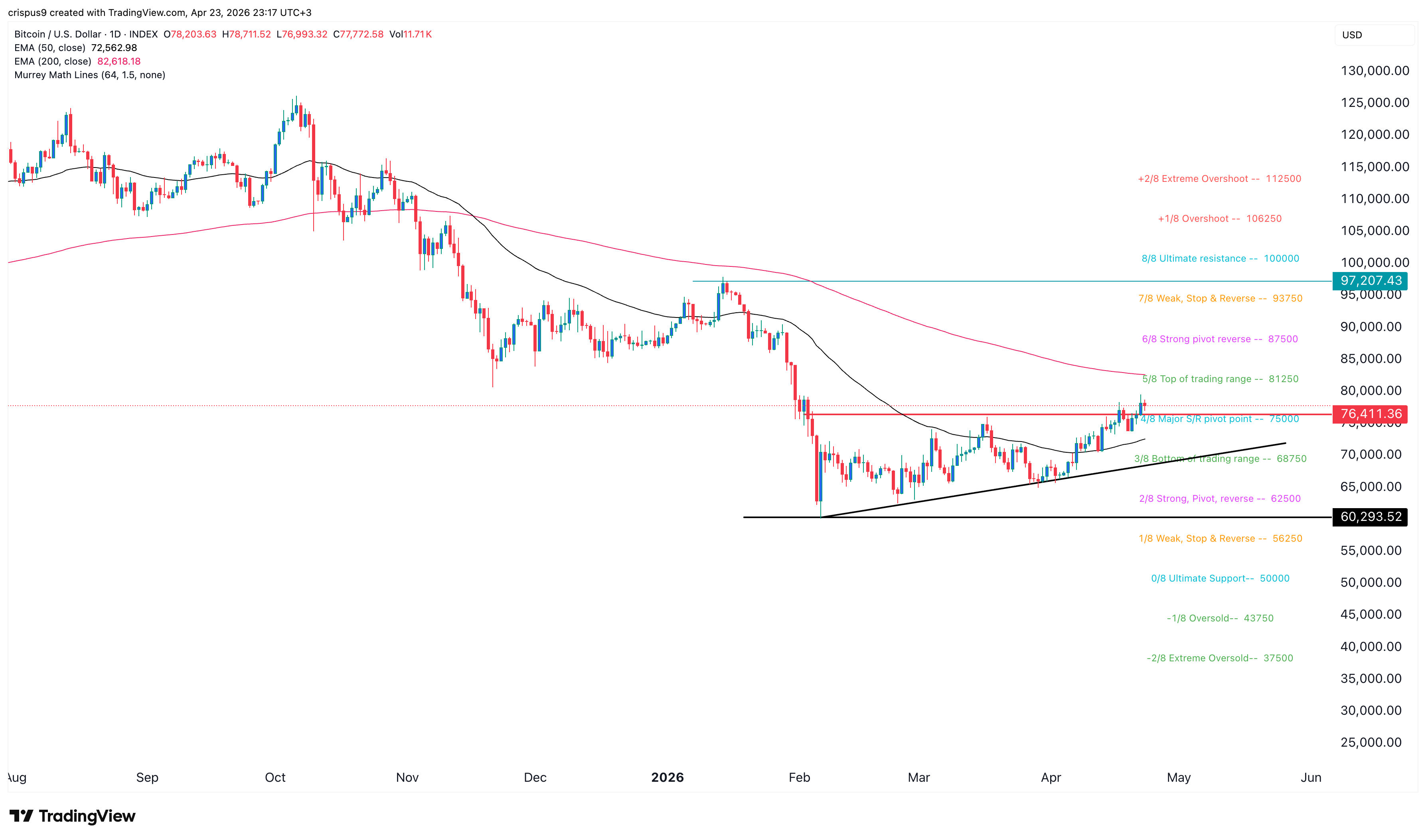 It has also moved above the Major S/R pivot point of the Murrey Math Lines tool. Therefore, the coin will likely continue rising as bulls target the key resistance level at $87,500. This price is along the Strong Pivot Reverse level of the Murrey Math Lines tool.