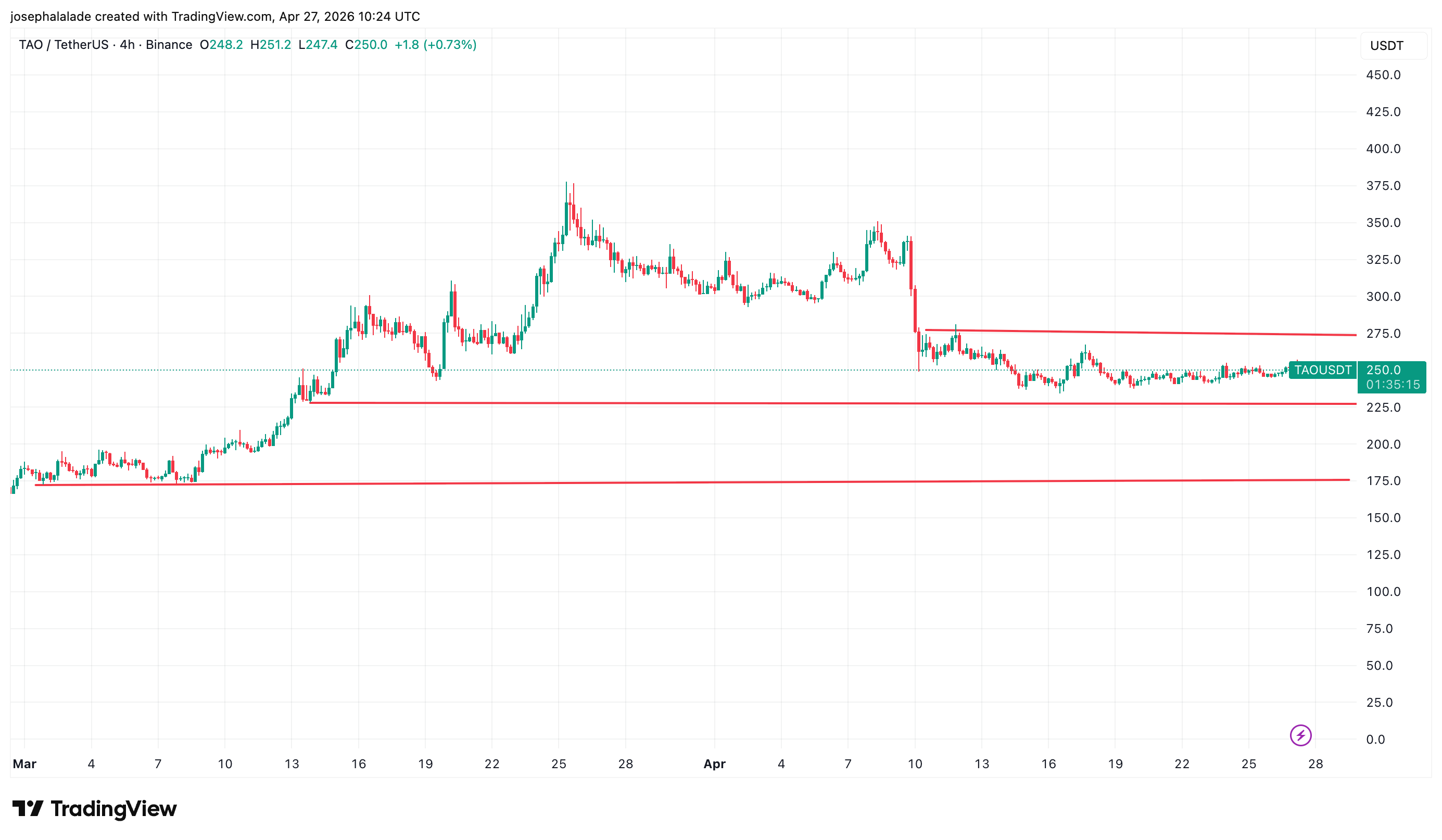 The 4H chart tells a story that hasn’t resolved cleanly in either direction. CyrilXBT flagged this zone on April 25th, as TAO sitting at $249 represented the third test of major support that held in both December and February, both times producing sharp upside moves.
