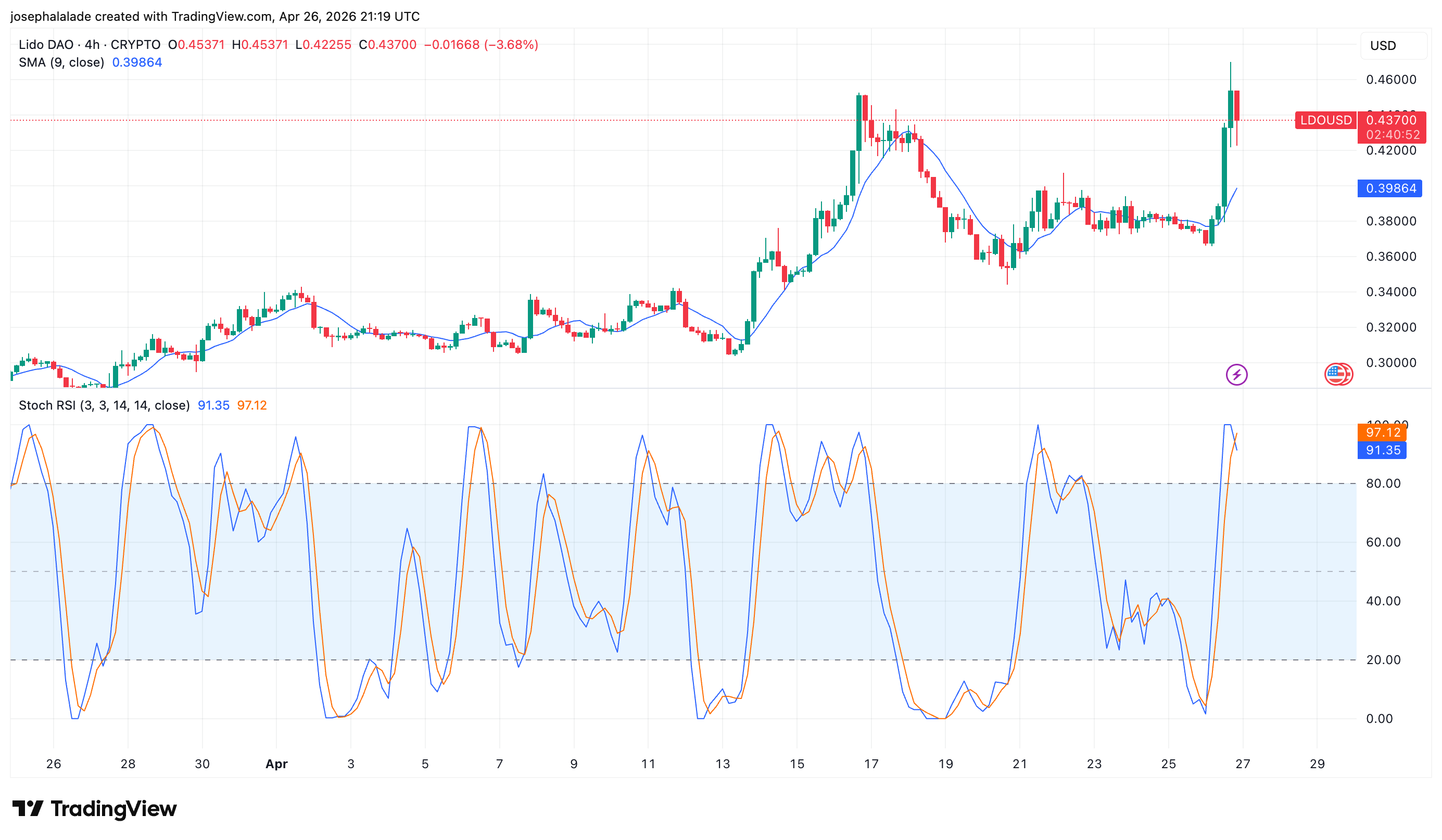 Lido DAO coin posted a 17% gain in 24 hours on April 26, ranking as the top performer across the entire CoinMarketCap top 100. The LDO price climbed from $0.3699 to an intraday peak near $0.46 before settling around $0.43, a move fuelled by the heaviest trading activity the token has seen in months.