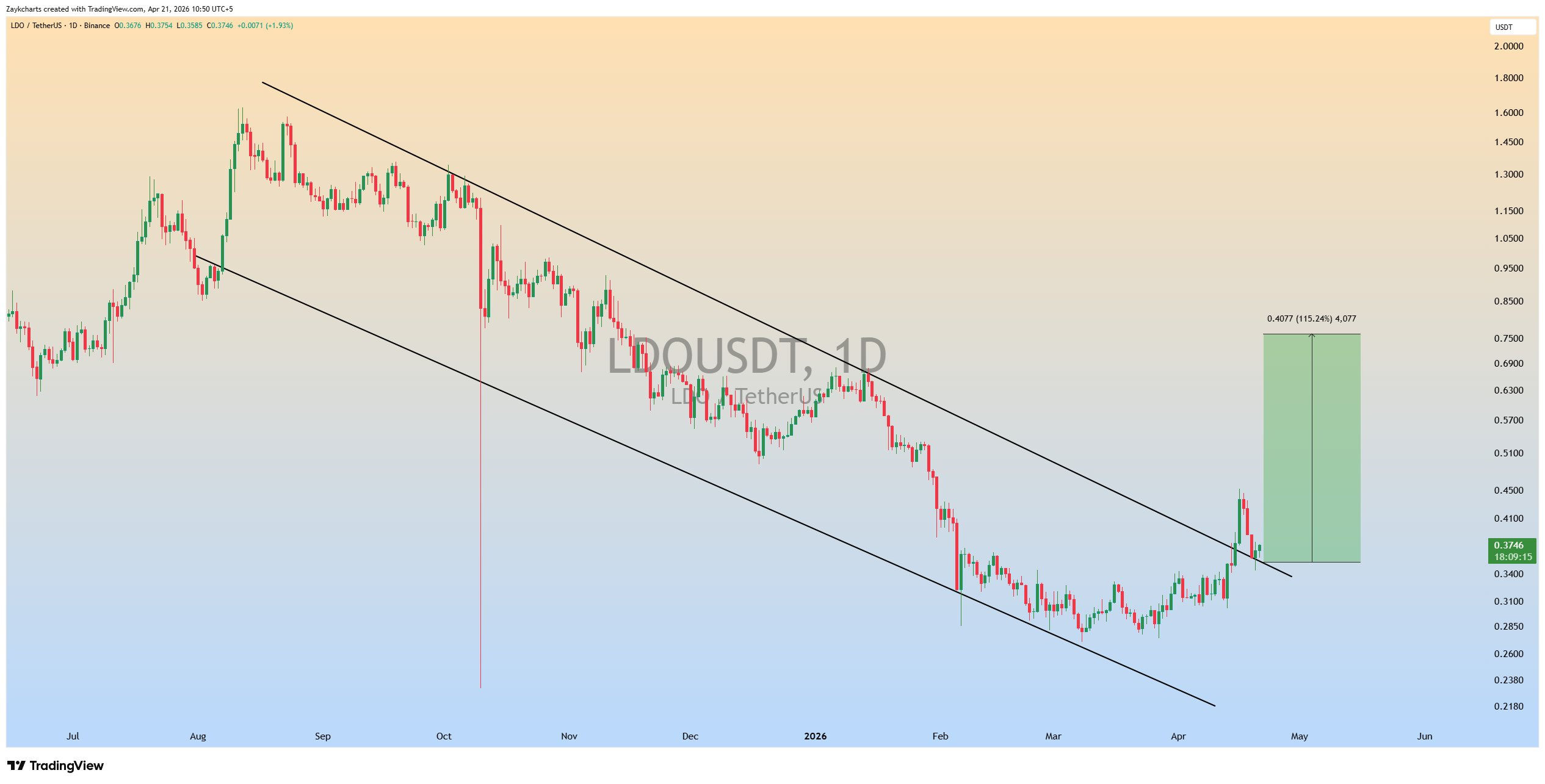 The technical picture on the 4-hour chart is clean but extended. Analyst ZAYK Charts confirmed that LDO’s descending channel breakout on the daily timeframe completed a full breakout-and-retest sequence, and projected a bullish continuation wave. The daily structure shows the token’s reclaiming channel resistance, which capped price action from mid-2025 through early 2026.