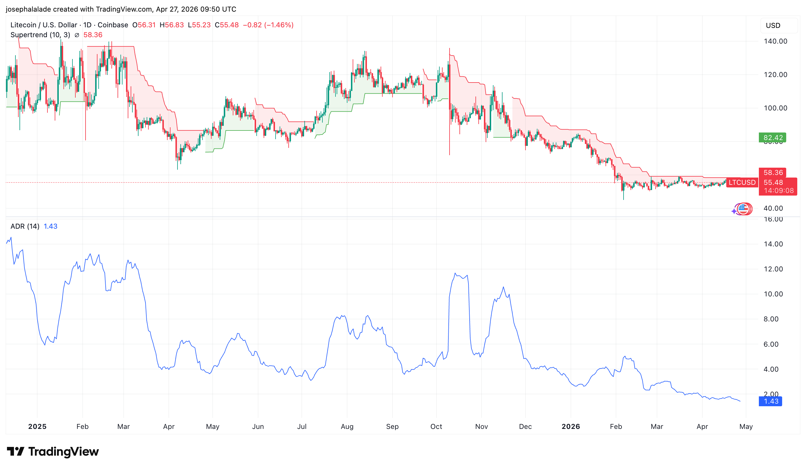 That said, channel bottoms still require confirmation through sustained demand and higher timeframe acceptance before any Litecoin price prediction targeting triple digits can be treated as more than a thesis. The daily Supertrend remains red. Until the price closes above $58.36 and the ADR expands, the weight of the evidence still points down.