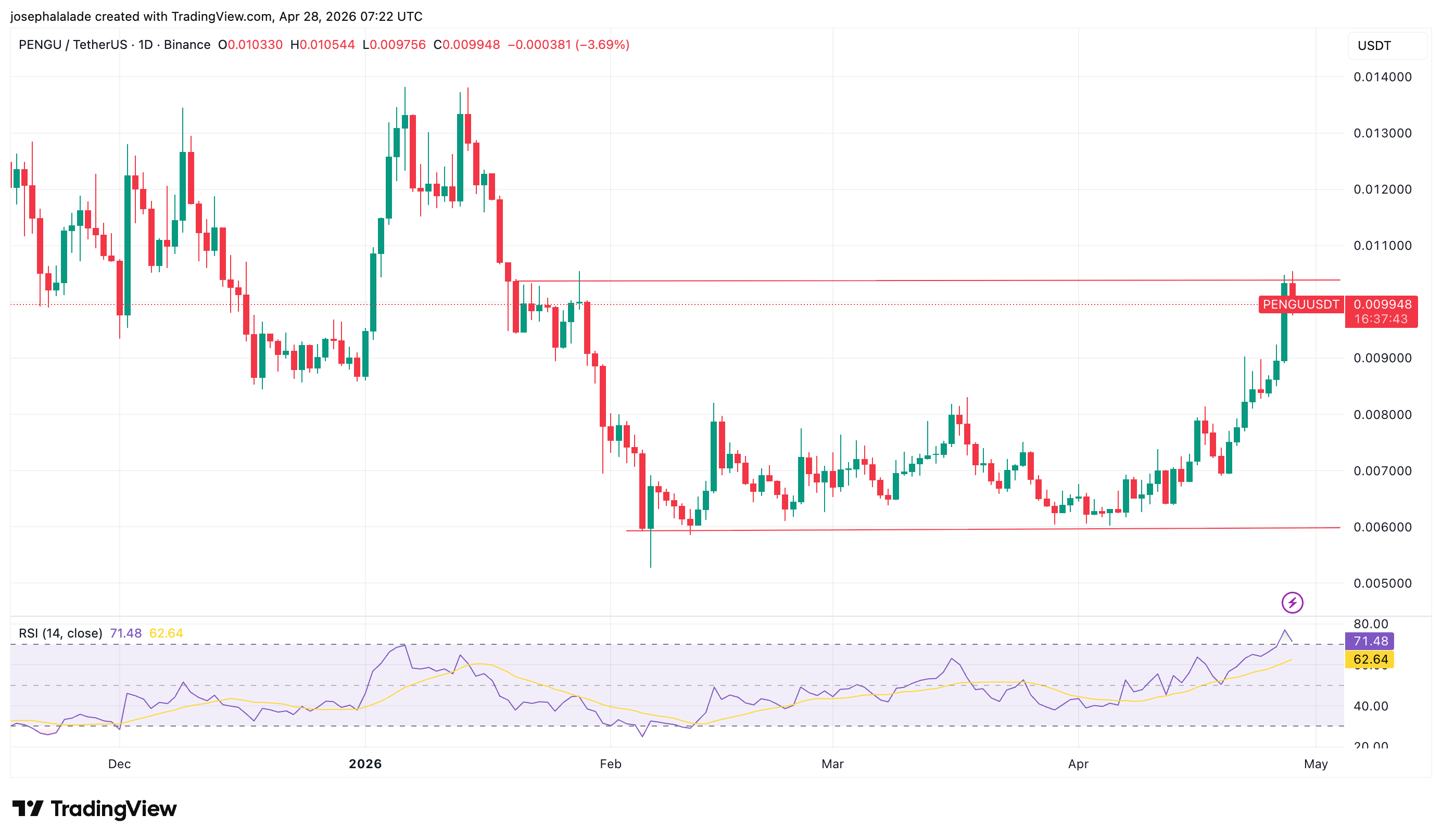 Pudgy Penguins Coin Stalls at $0.0105 as RSI Hits Overbought Territory