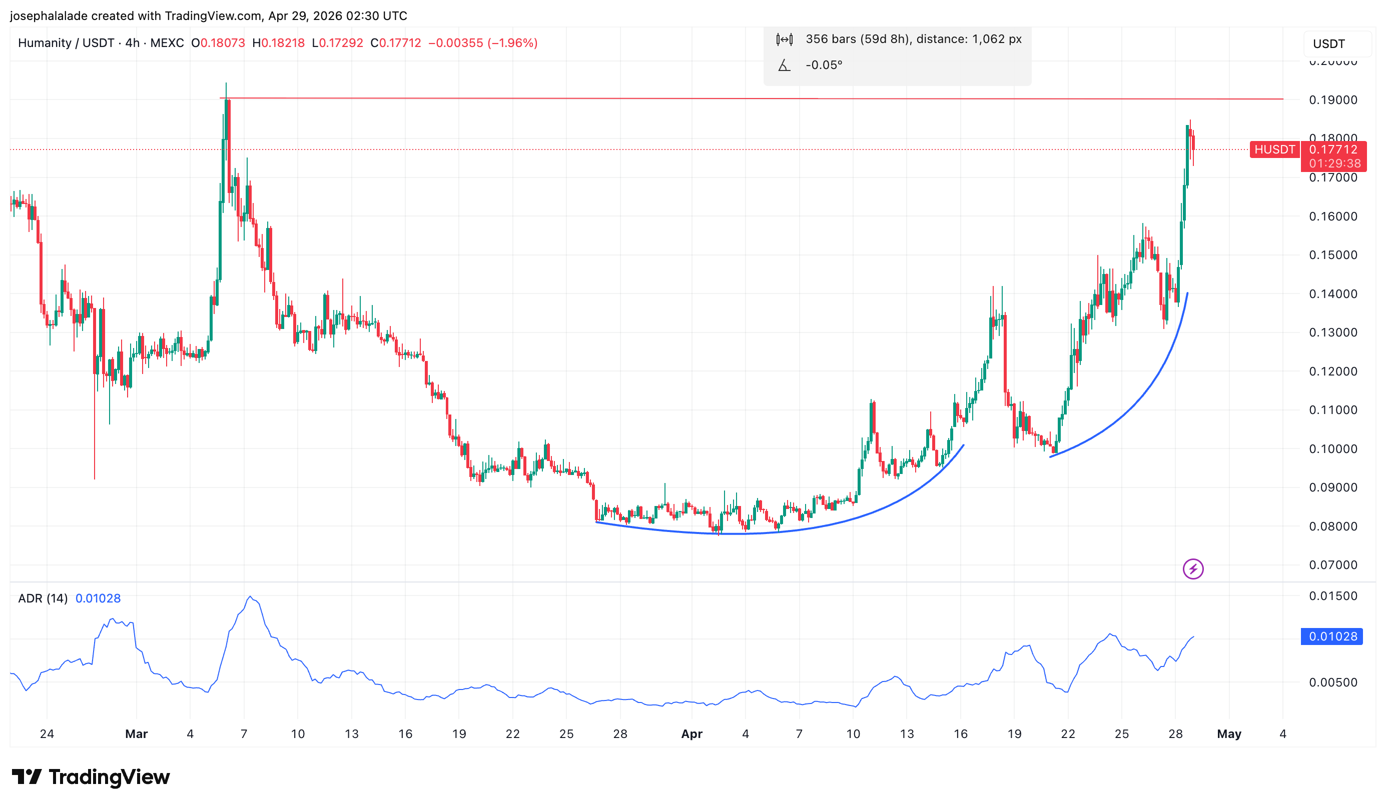 From a base near $0.08 in late March, $H printed a rounding bottom across four weeks: higher lows at $0.09, $0.10, and $0.14 showed buyers stepping in progressively earlier, compressing the structure before the vertical leg developed.