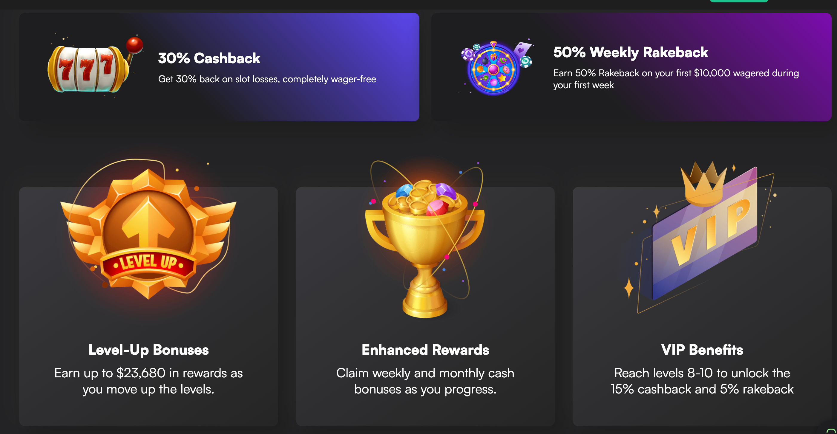 •30% Cashback Bonus Get 30% cashback on your first deposit slot losses, up to $200
