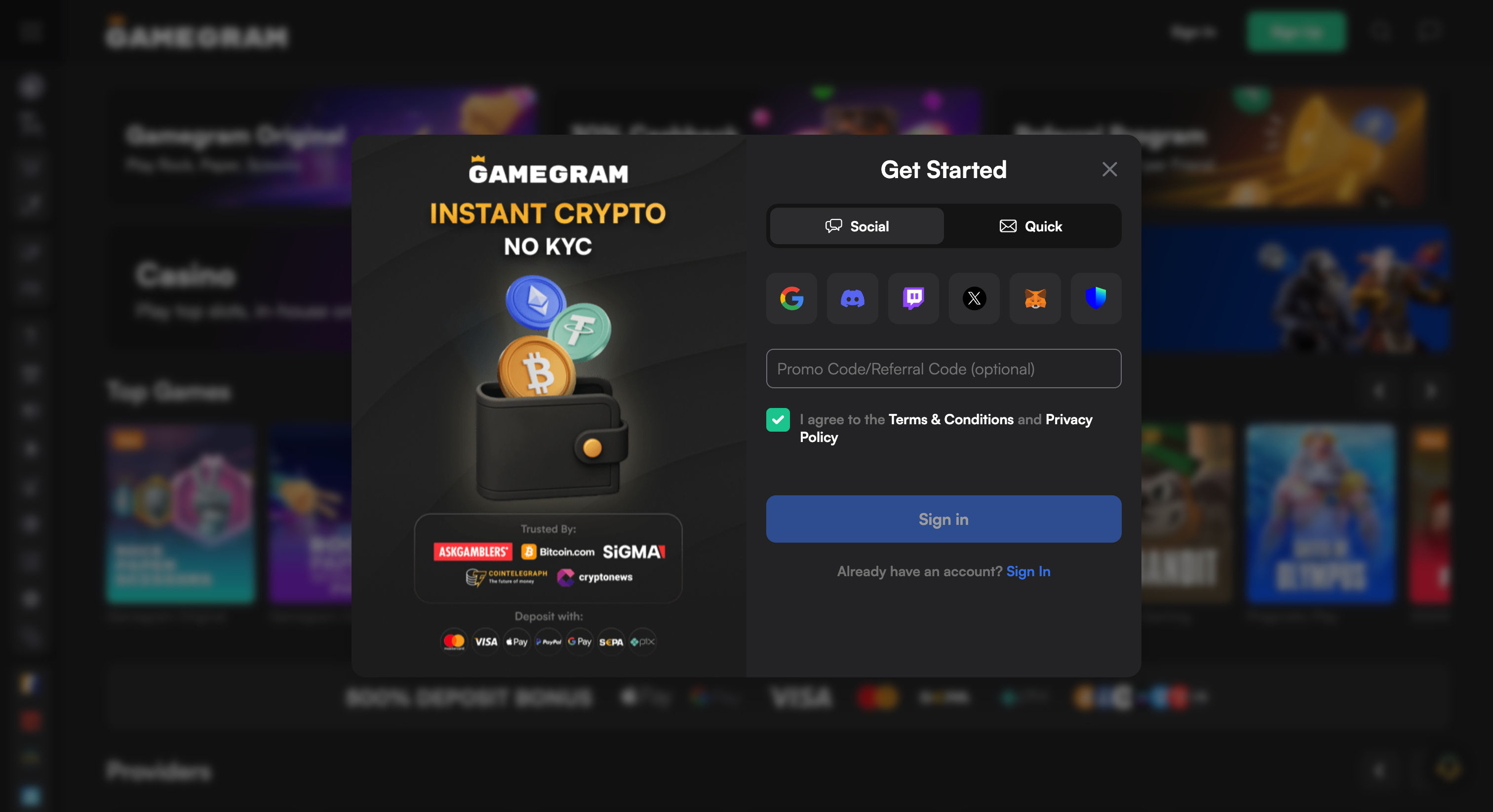 Yes, Gamegram supports both Bitcoin and Ethereum, along with eight other cryptocurrencies including USDT, LTC, TRX, BCH, XRP, DOGE, DAI, and USDC. The minimum deposit is 0.0001 BTC or equivalent in other currencies. All crypto deposits appear in your account within minutes, and the platform charges no fees for deposits or withdrawals (though standard blockchain network fees apply).